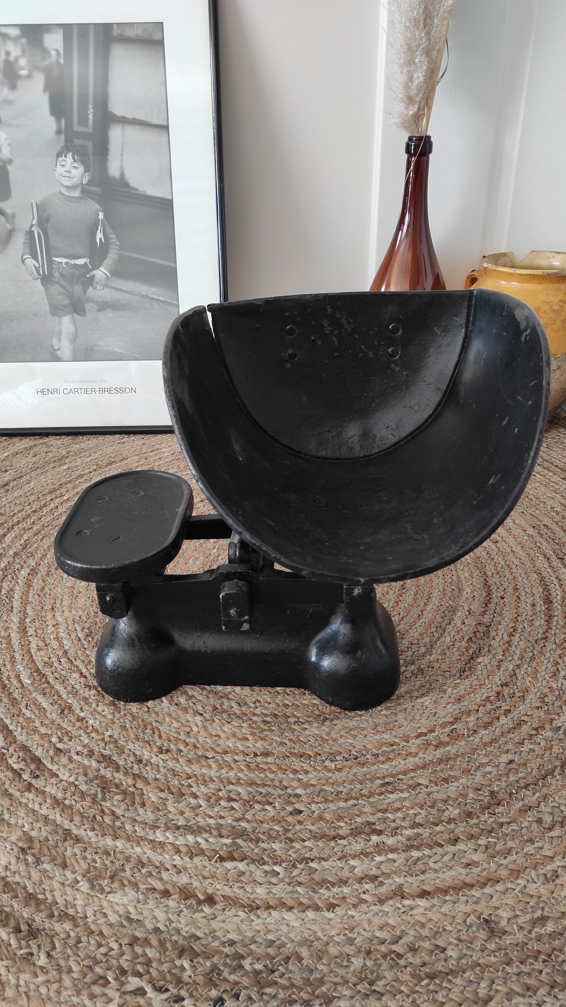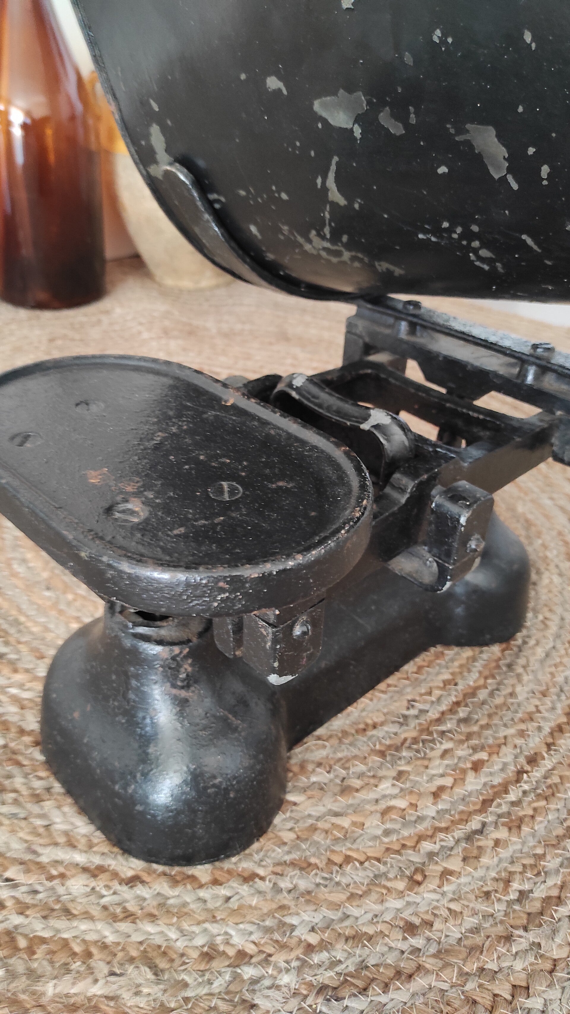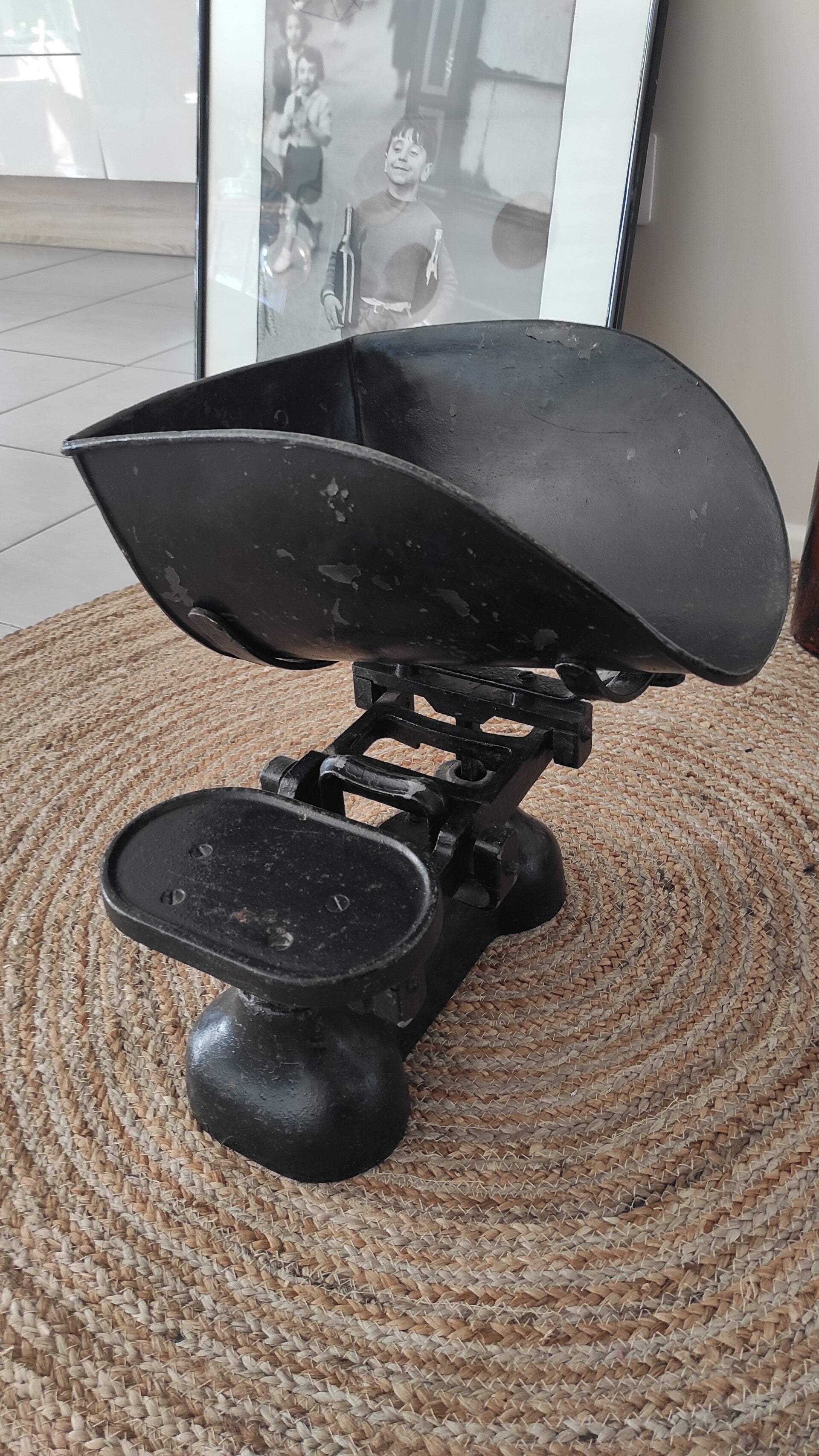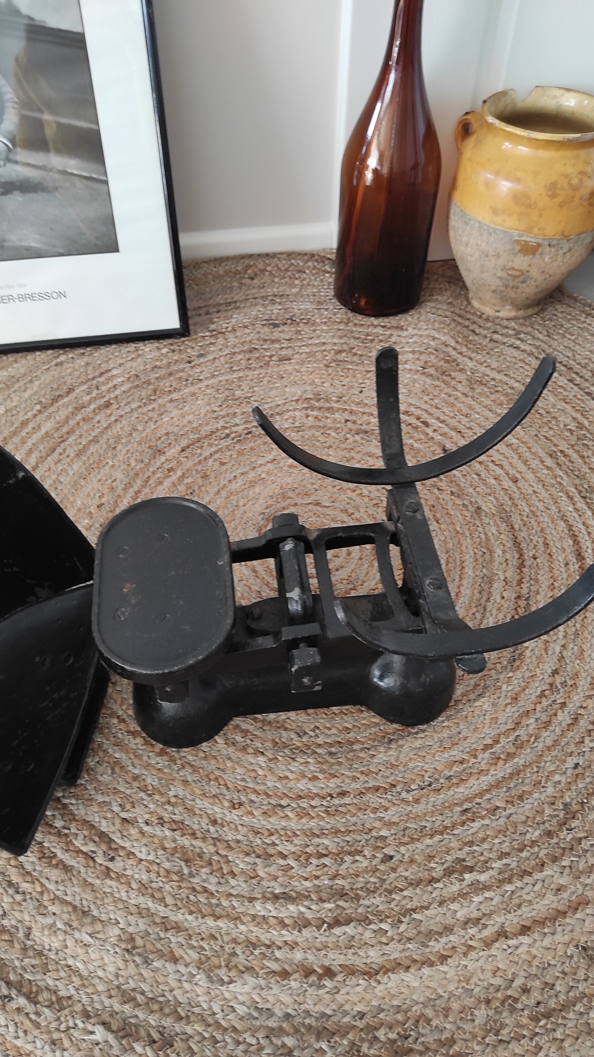Ancienne balance à charbon, avec son grand bac pour peser (bac légèrement fêlé sur le dessus mais utilisable encore)Fonctionnelle, peux servir en balance de cuisine, décoration.