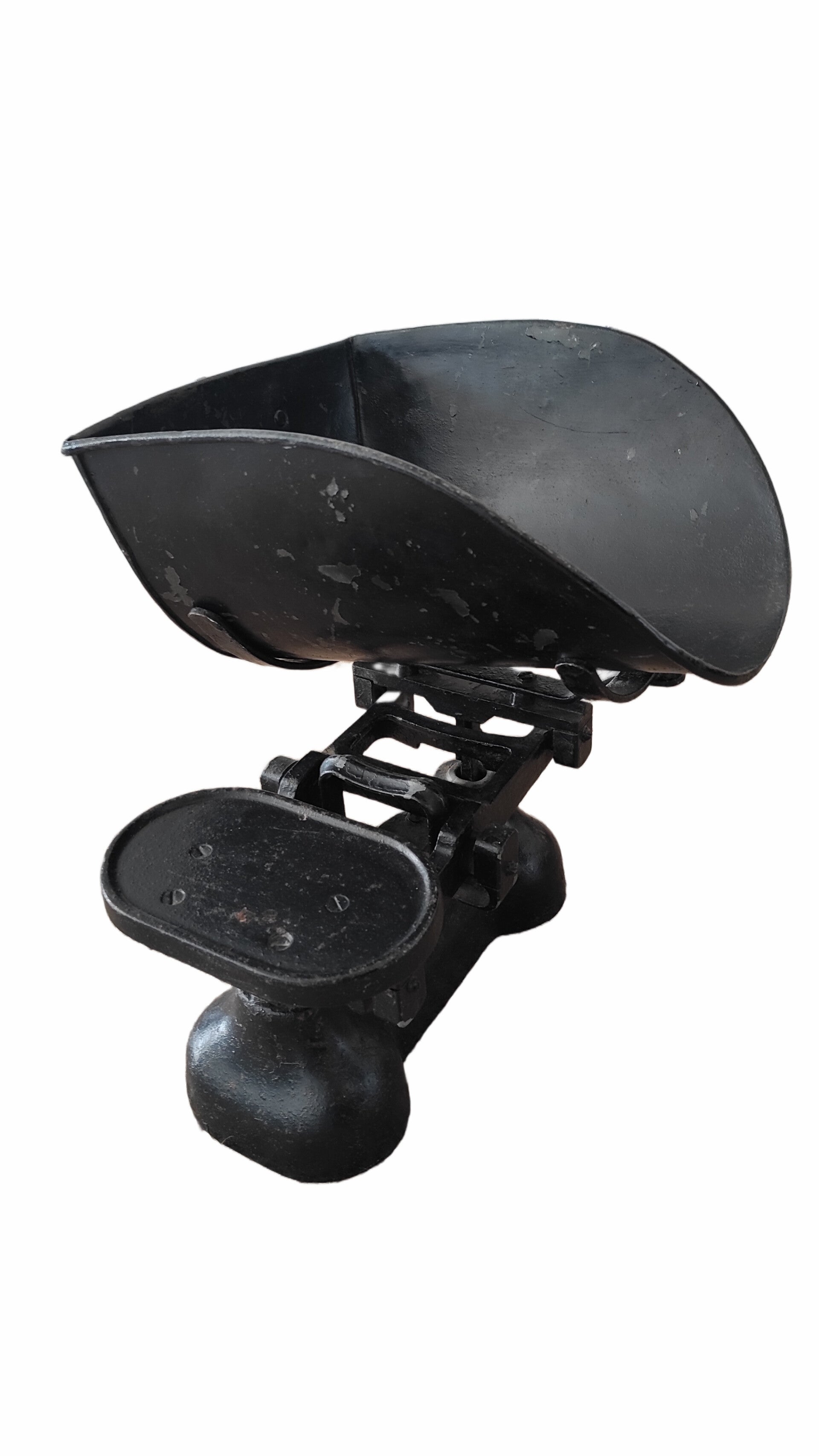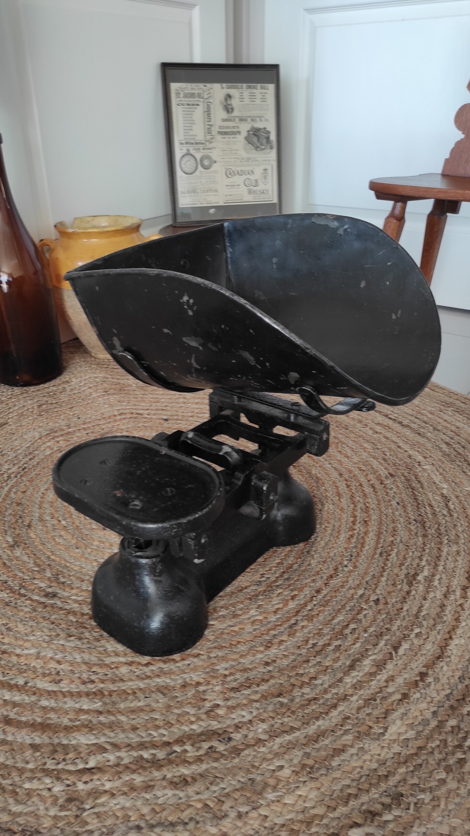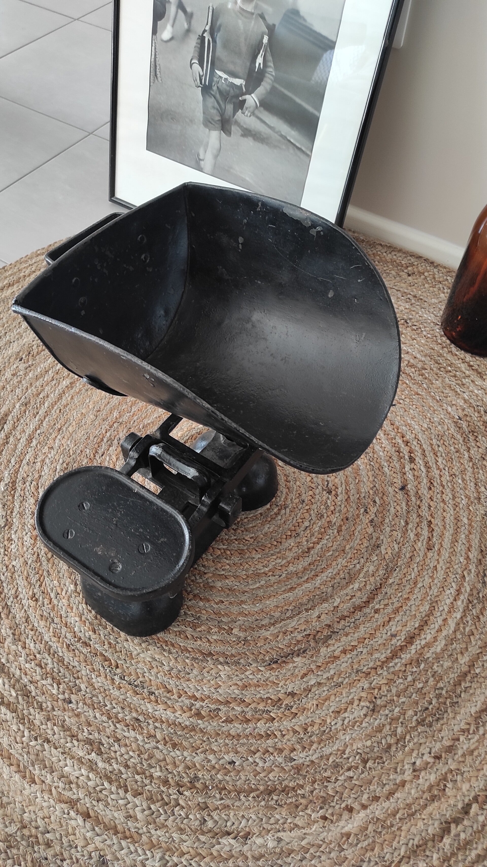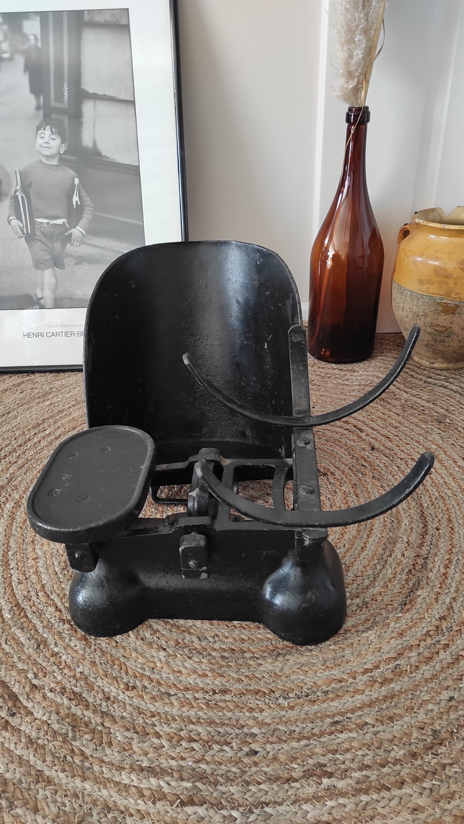 Ancienne balance à charbon, avec son grand bac pour peser (bac légèrement fêlé sur le dessus mais utilisable encore)Fonctionnelle, peux servir en balance de cuisine, décoration.