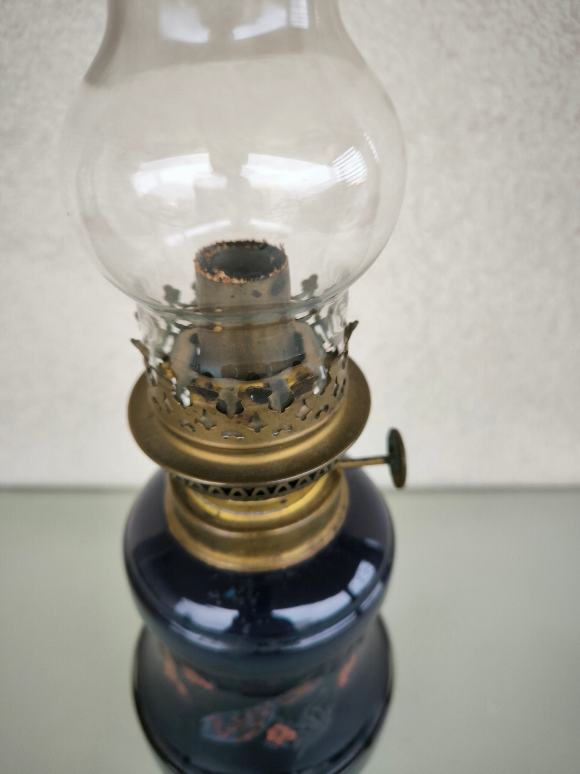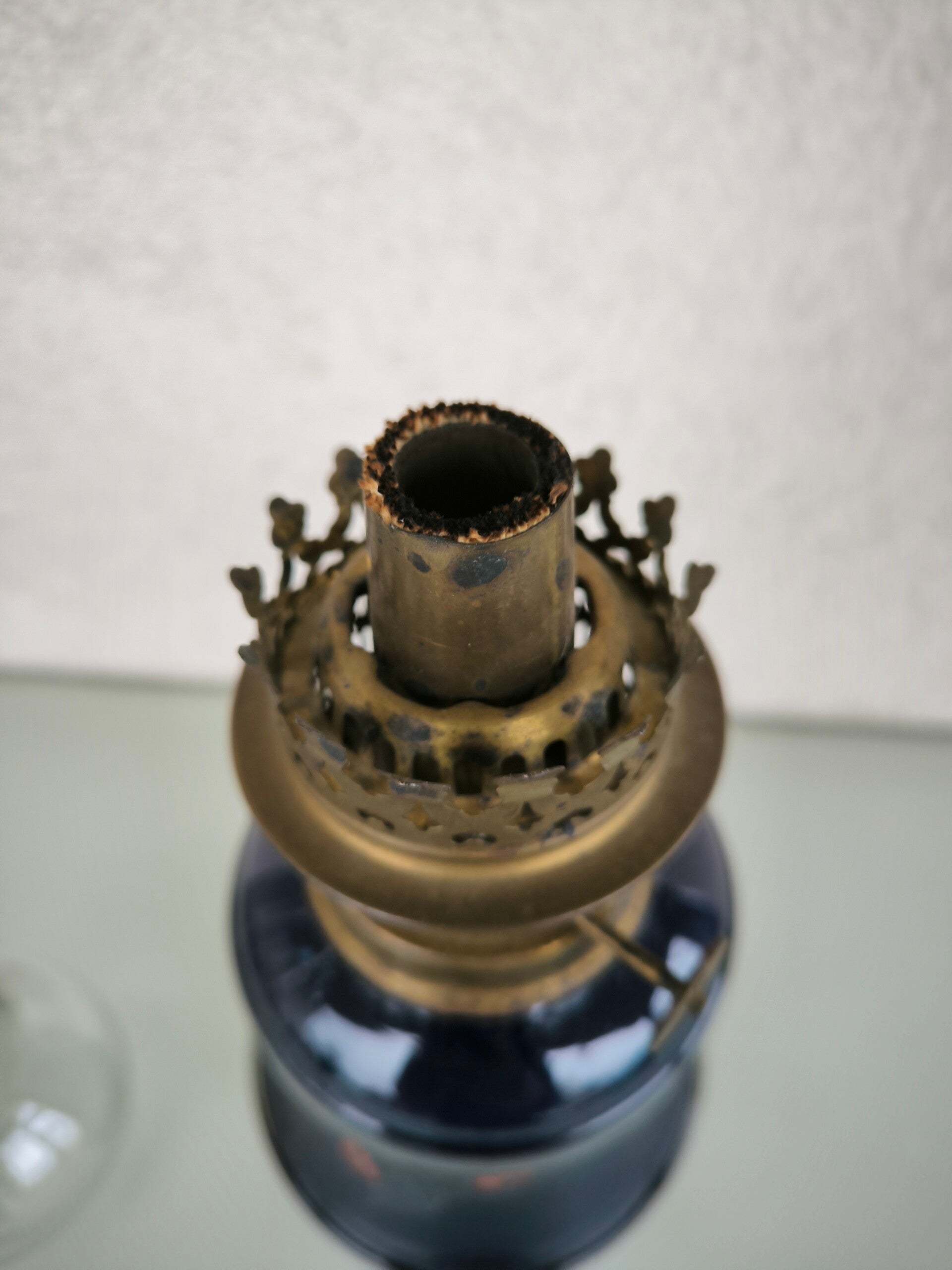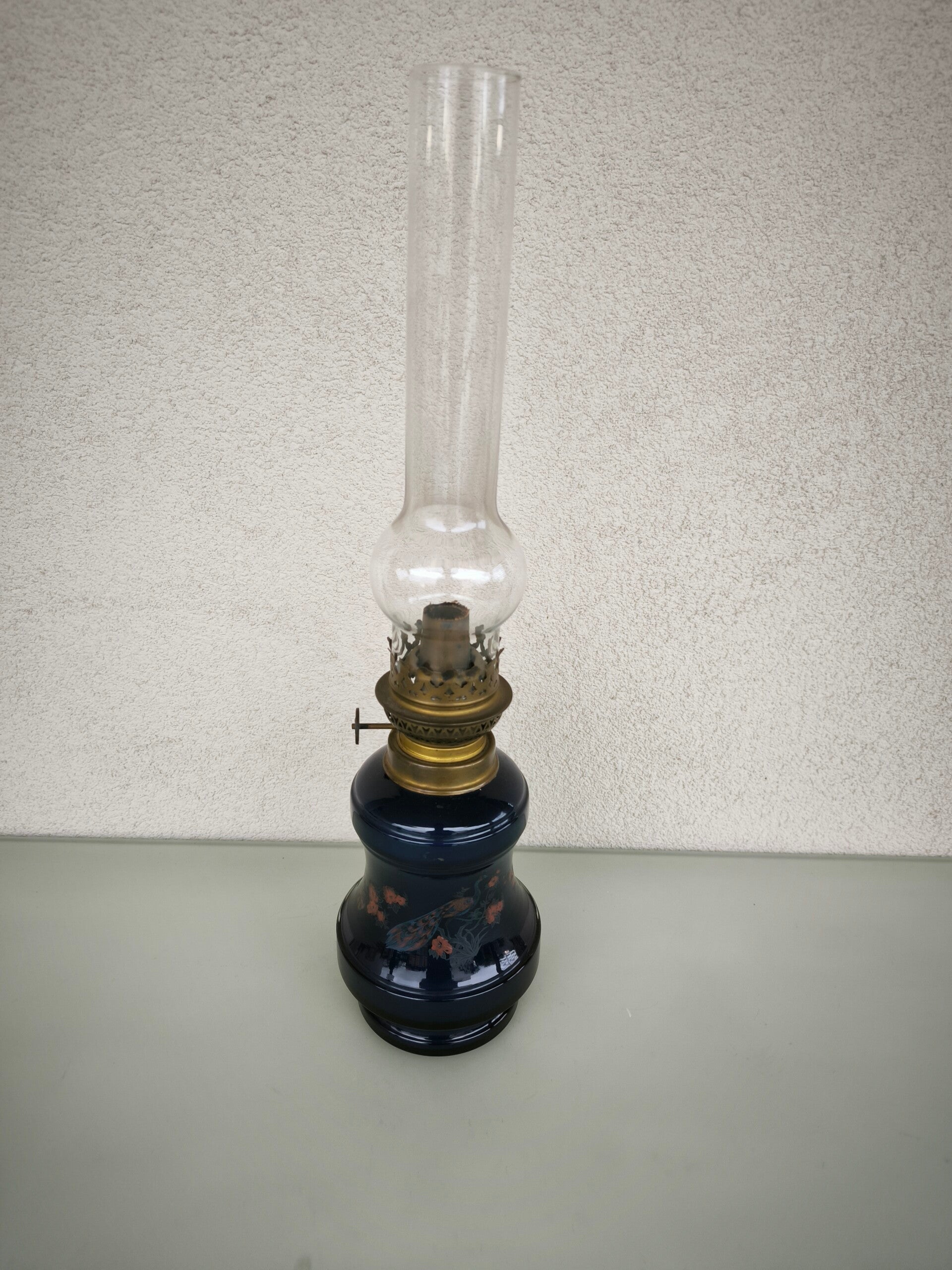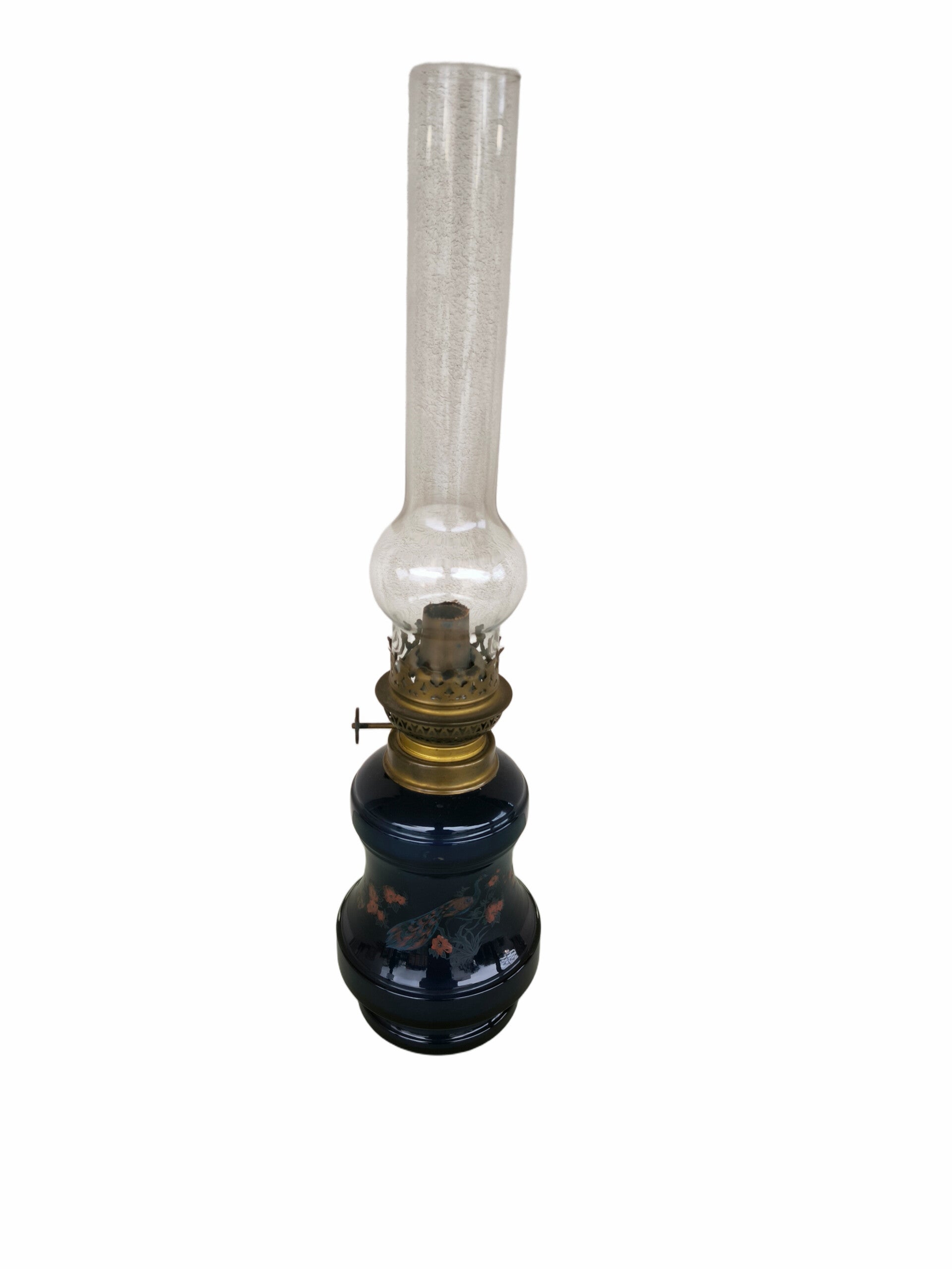 Lampe à pétrole en porcelaine émaillée bleuePeinture à la main motif floraux et de l'animal le panXIXème siècleMonture en bronze ciselé doré Verre soufflé.
