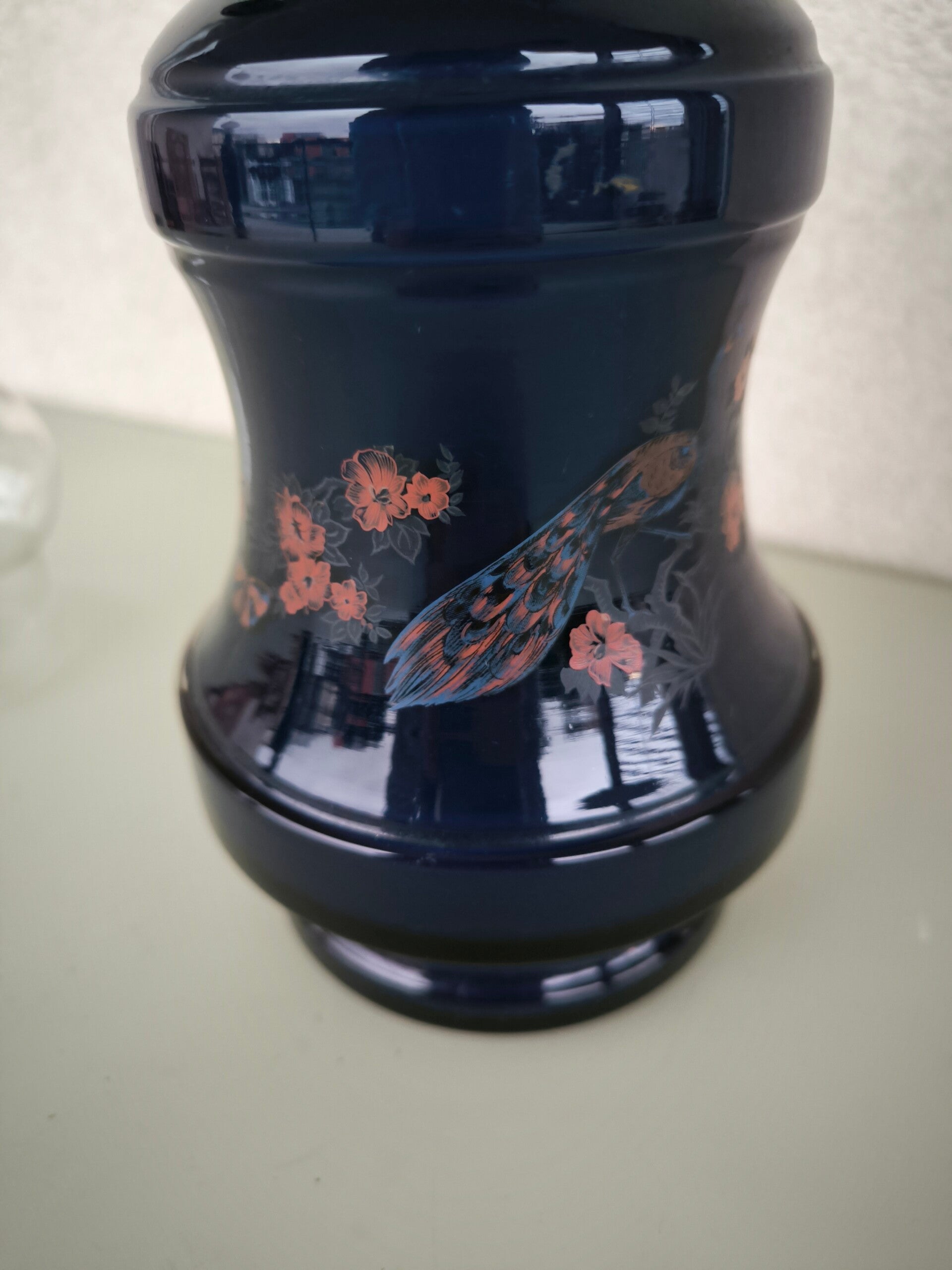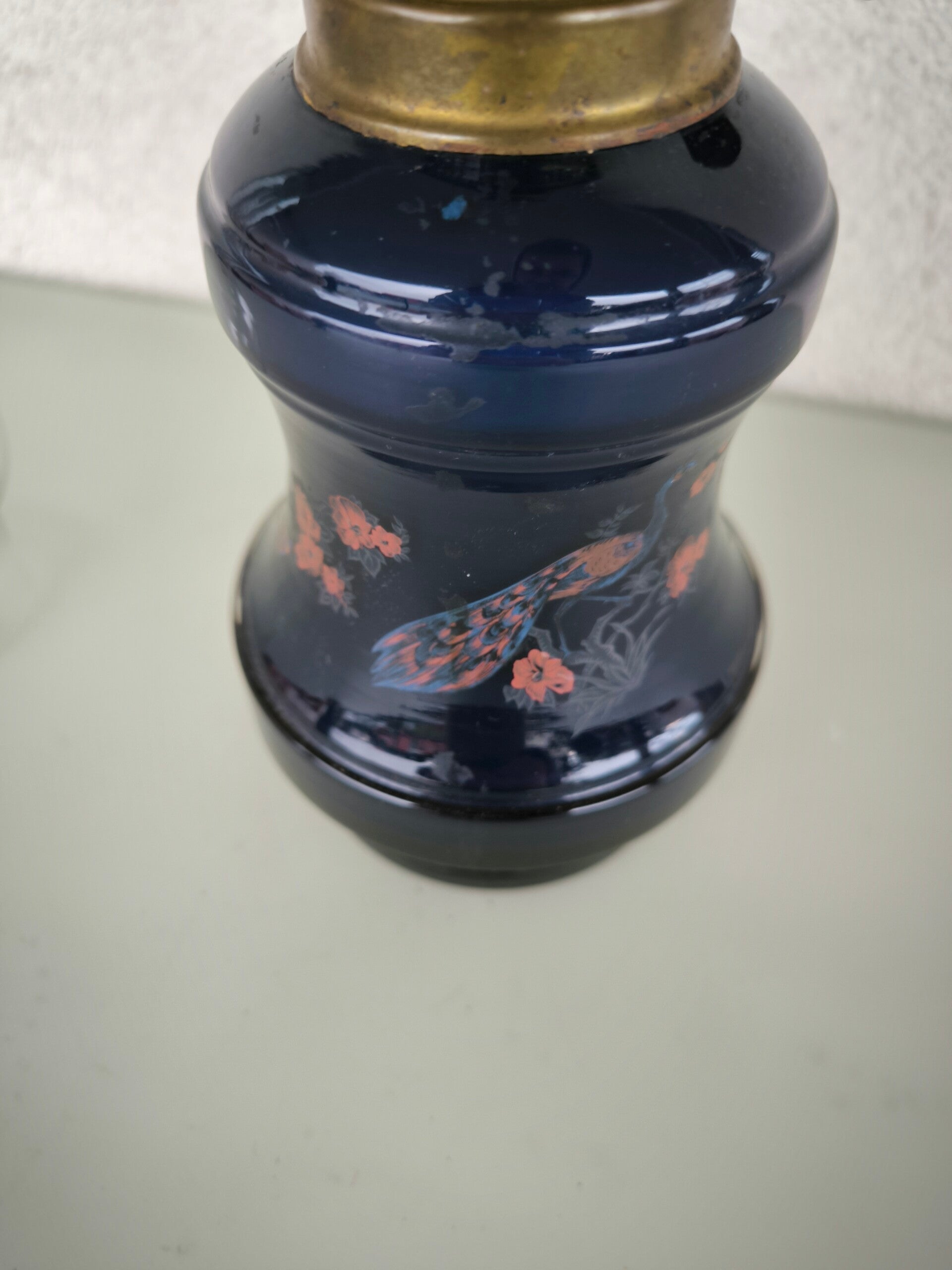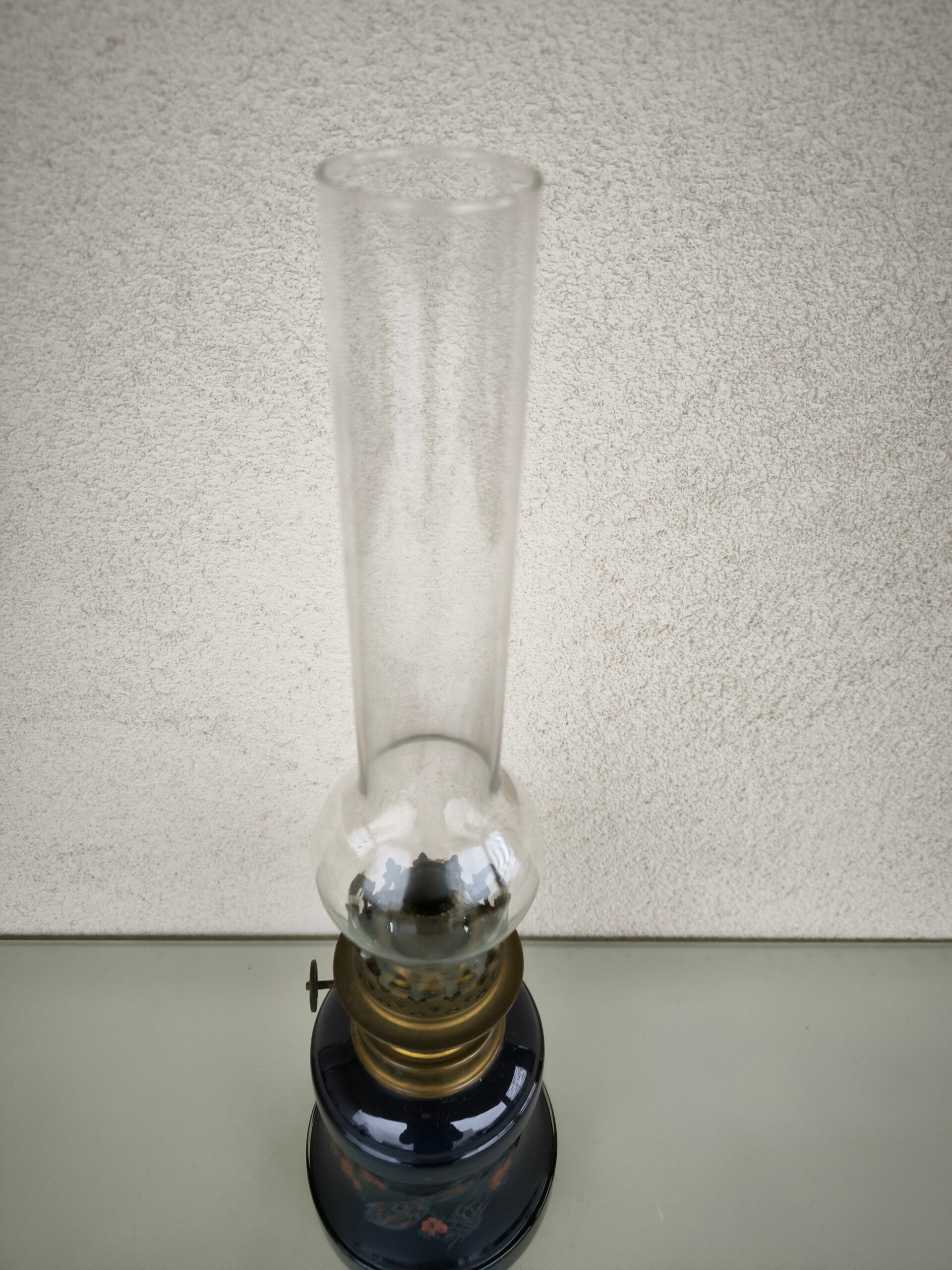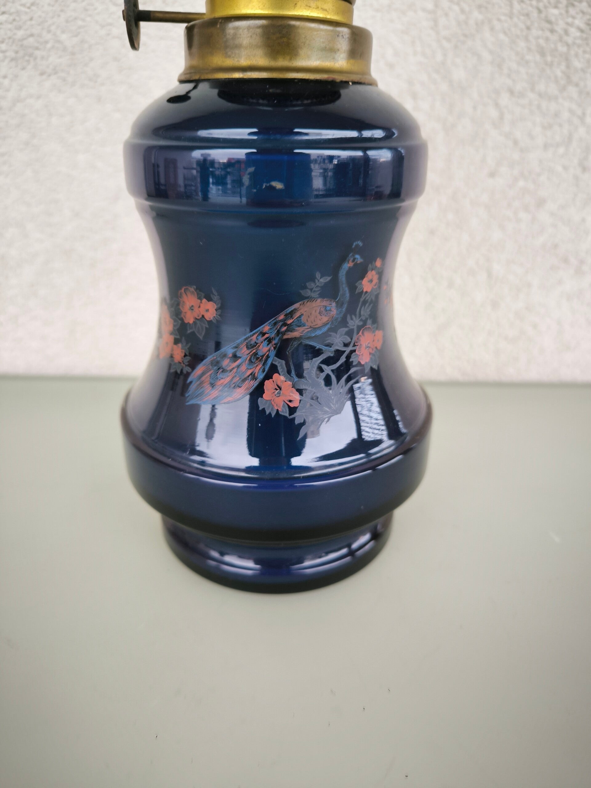 Lampe à pétrole en porcelaine émaillée bleuePeinture à la main motif floraux et de l'animal le panXIXème siècleMonture en bronze ciselé doré Verre soufflé.