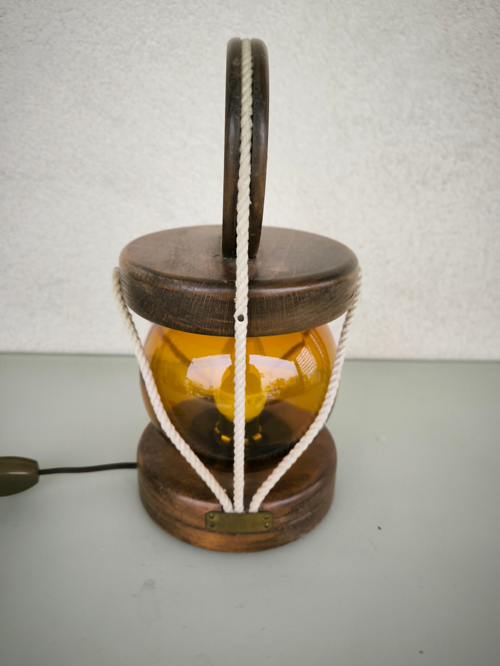 Lampe à poser en bois, verre soufflé et corde.Style marin, dans l'esprit des créations d'Audoux Minet.