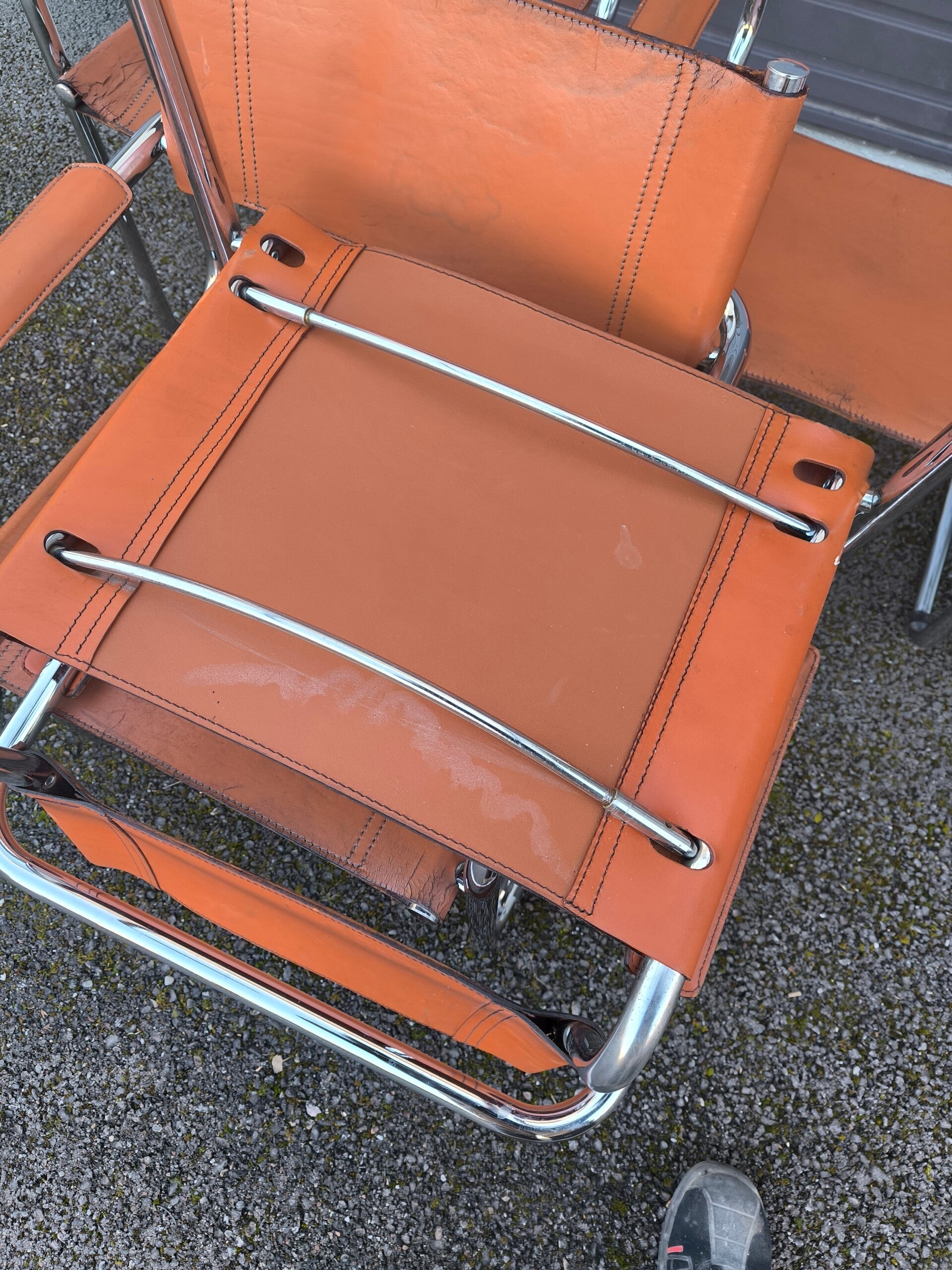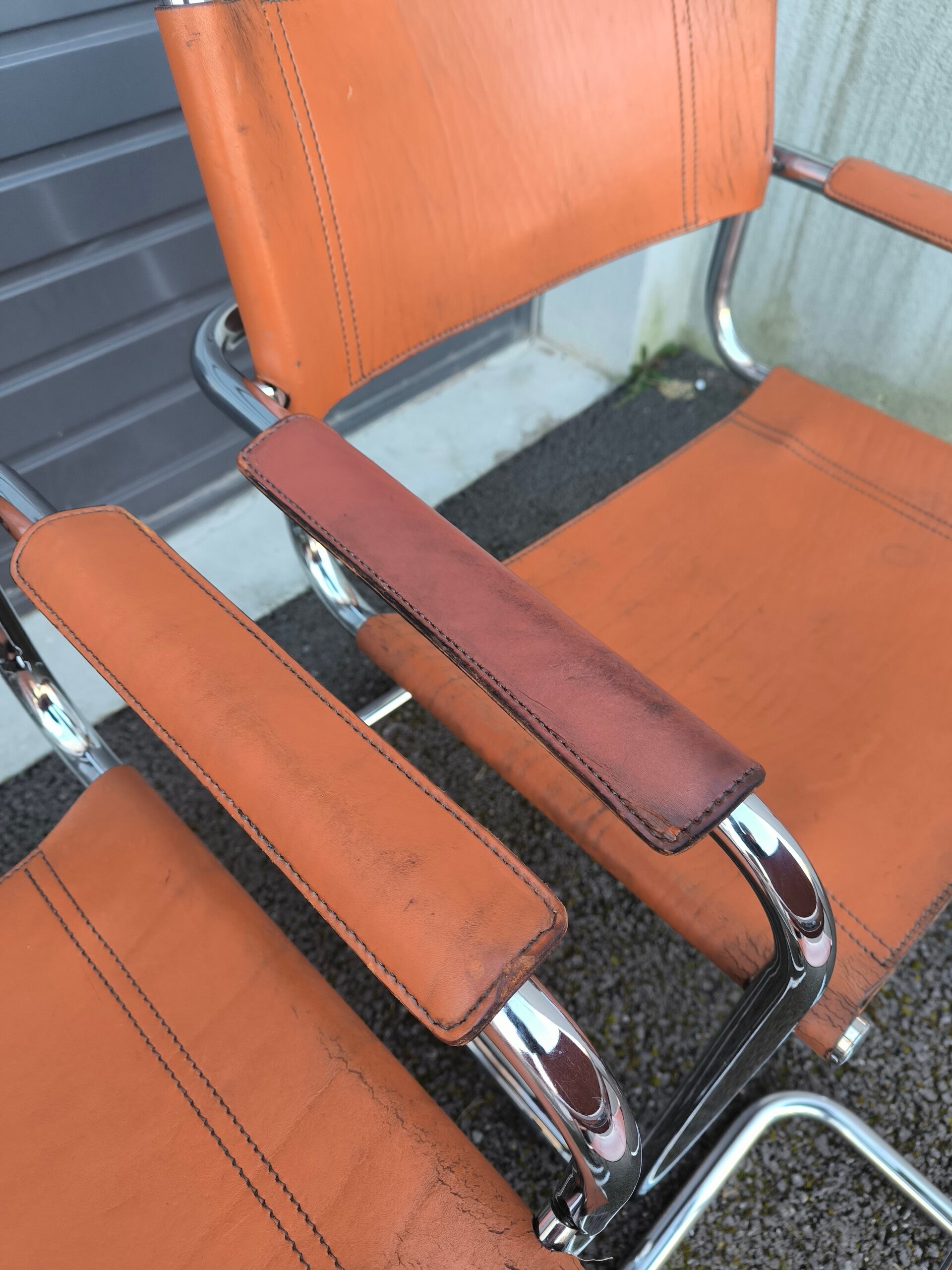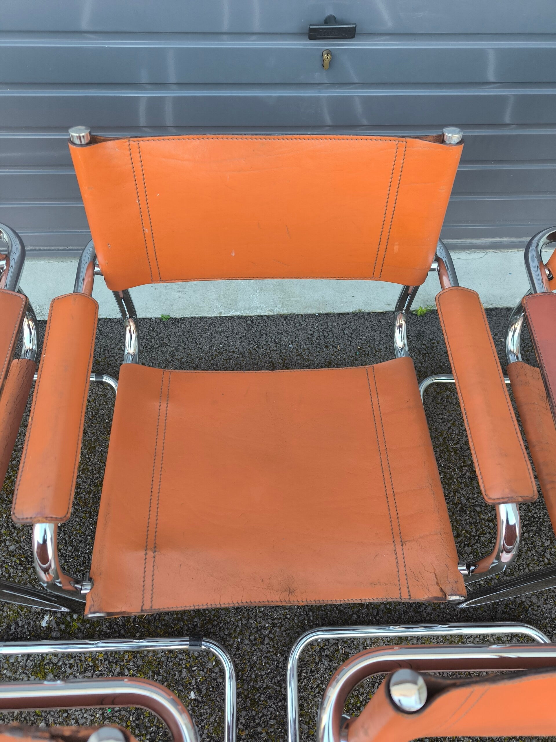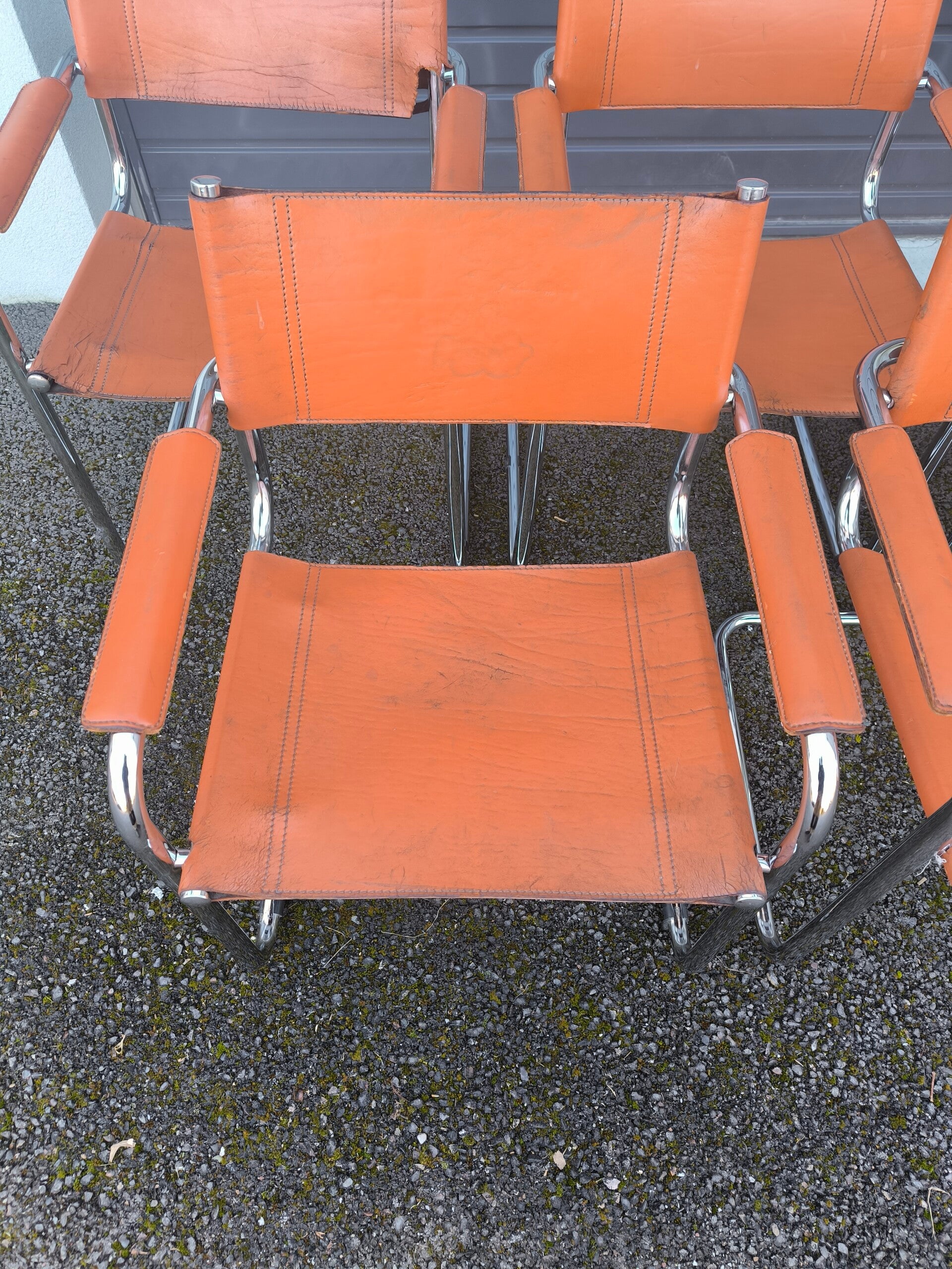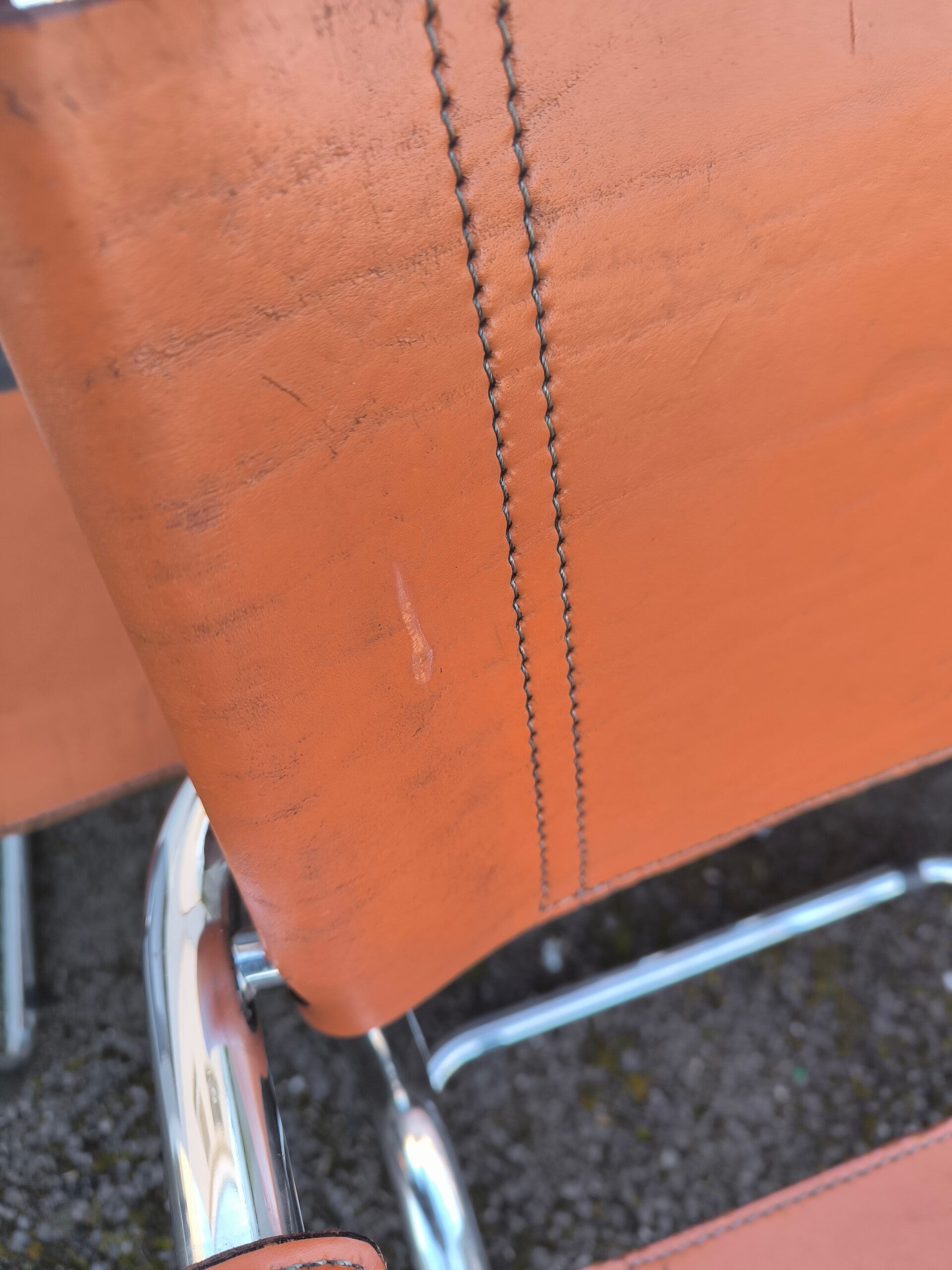 Le dossier et l’assise sont tendus d’un cuir fauve épais. Piqués à point sellier, certaines coutures sont abîmées (dont un dossier et une assise déchirée partiellement, peut se réparer chez un tanneur).