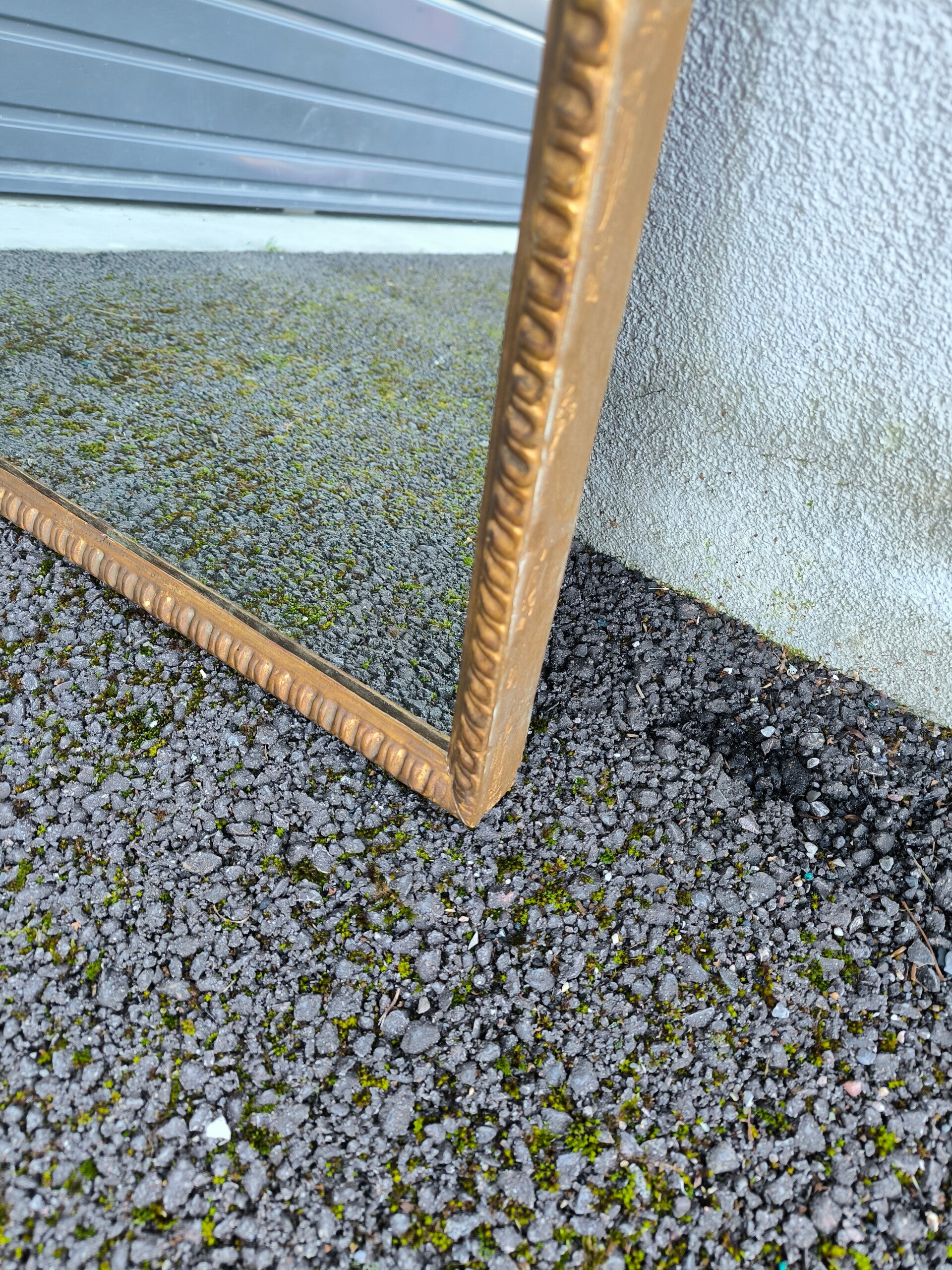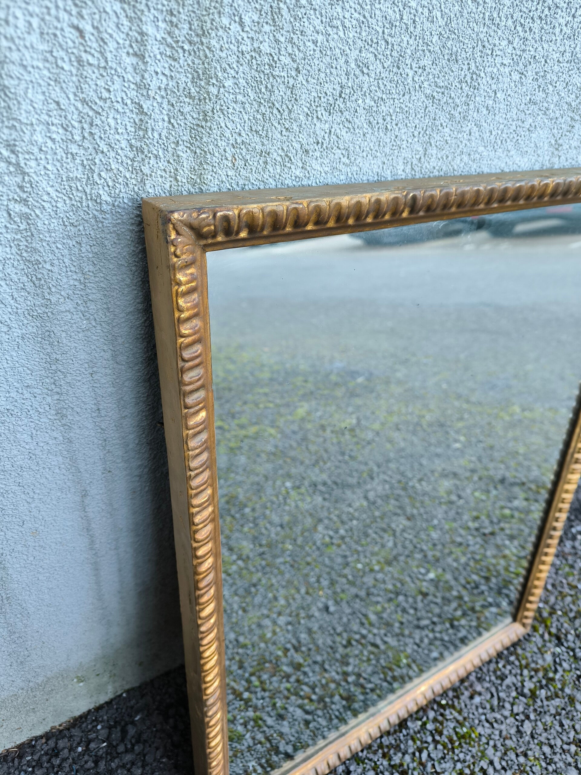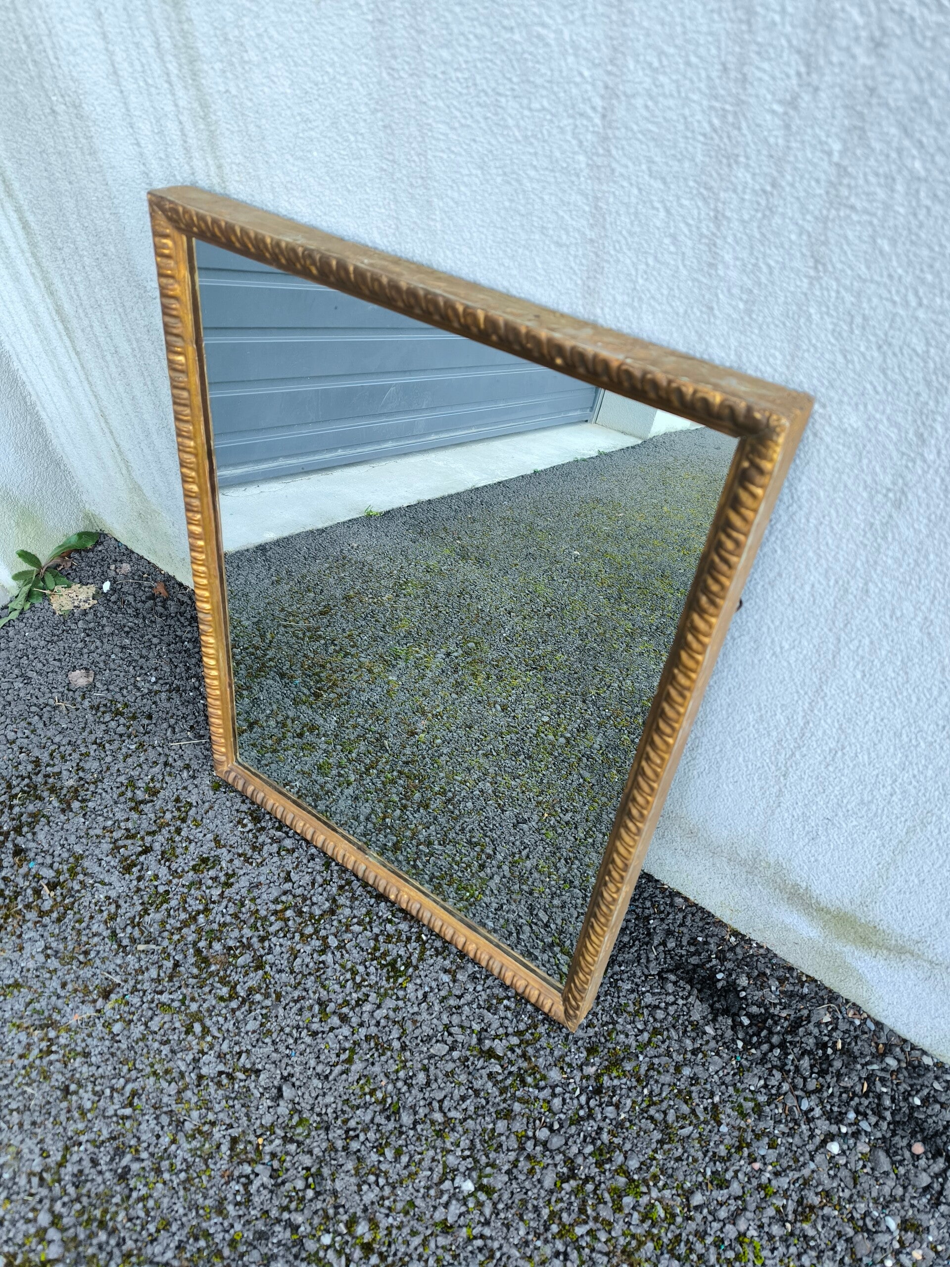 Miroir classique rectangulaire mural ancien, en bois sculpté doré.Bon état, traces d'usures.