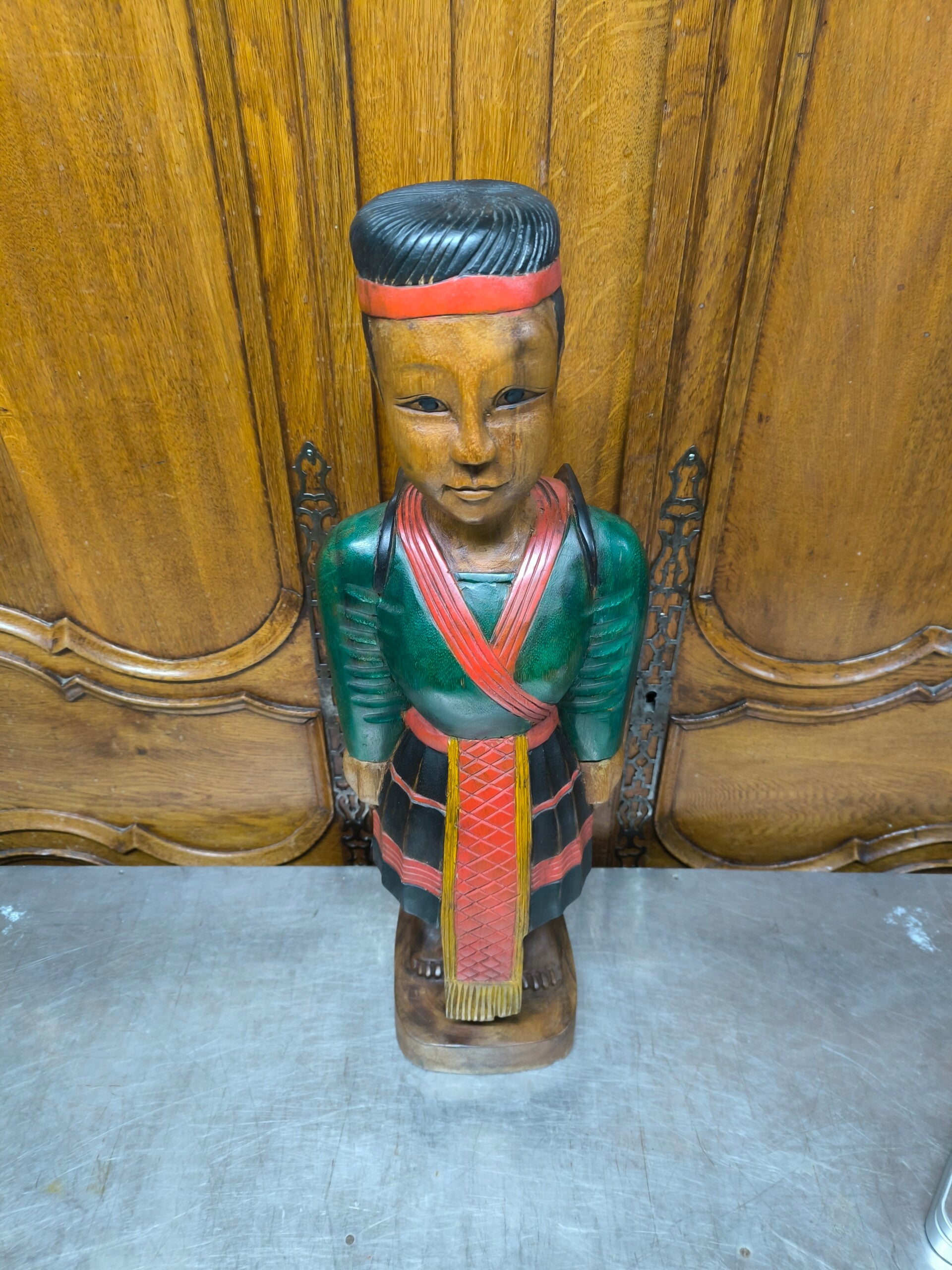 Statue indonésienne en bois polychrome fait main.Traces d'usures.