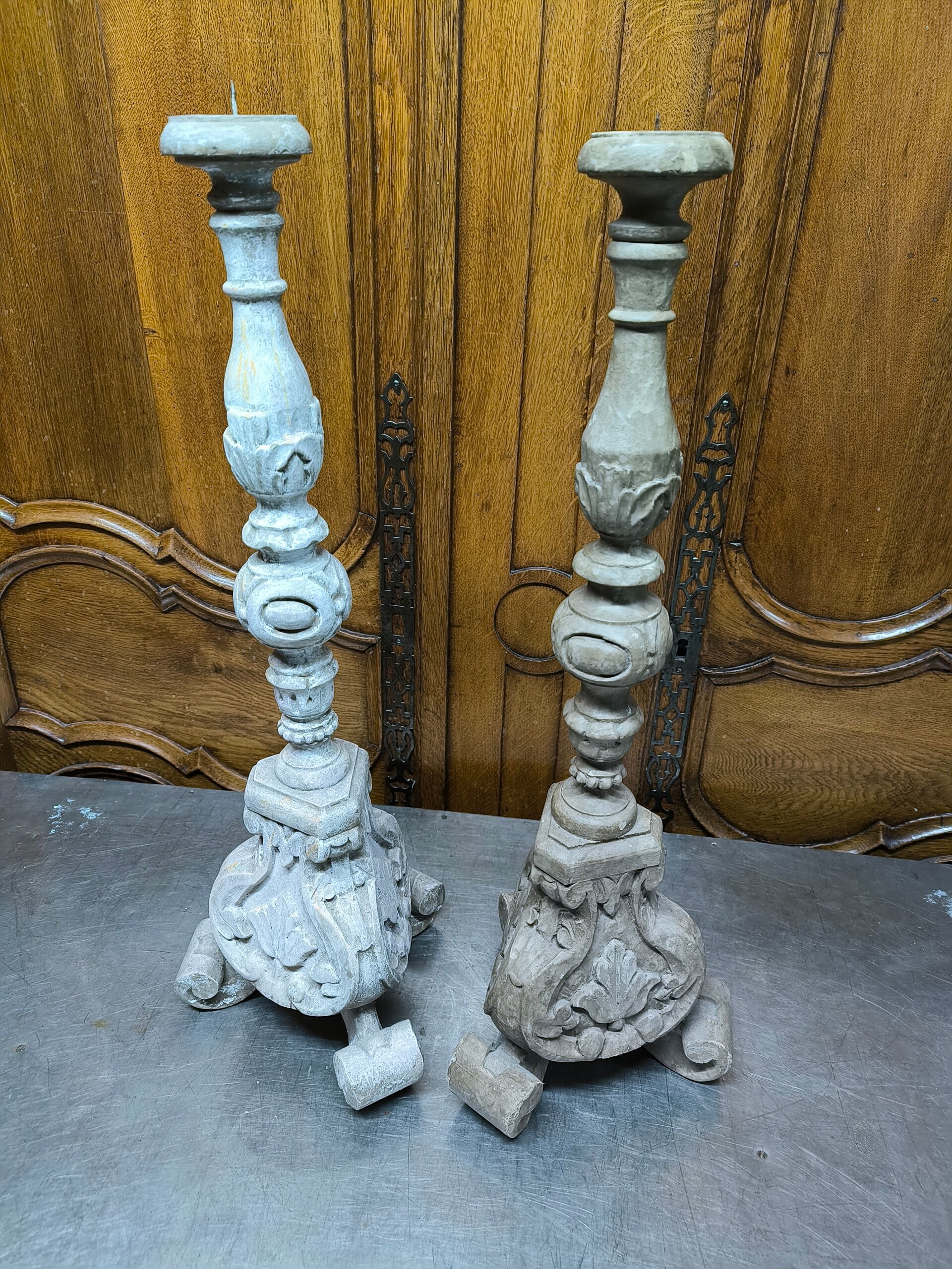 Paire de chandelier en bois sculpté.Différence de teinte sur les deux.Hauteur 62cmLargeur 22cmProfondeur 20cmPoids 3kg