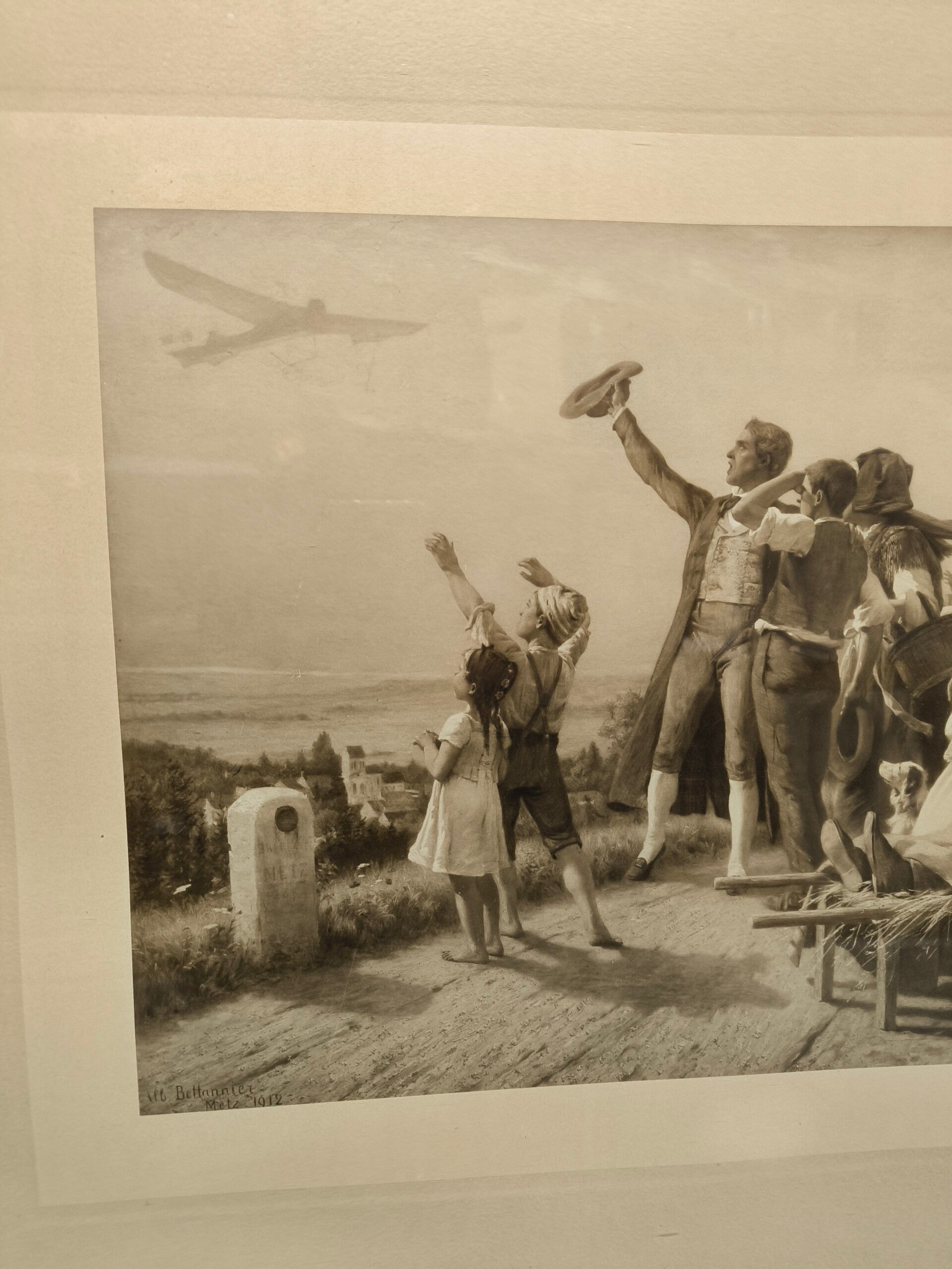 Cette lithographie d'Albert Bettannier (originaire de Loraine, Metz) représente un groupe d'alsaciens (identifiés par leur costume) qui regarde en direction de la France (le petit village) et l'avion (l'oiseau) qui tire un drapeau tricolore.