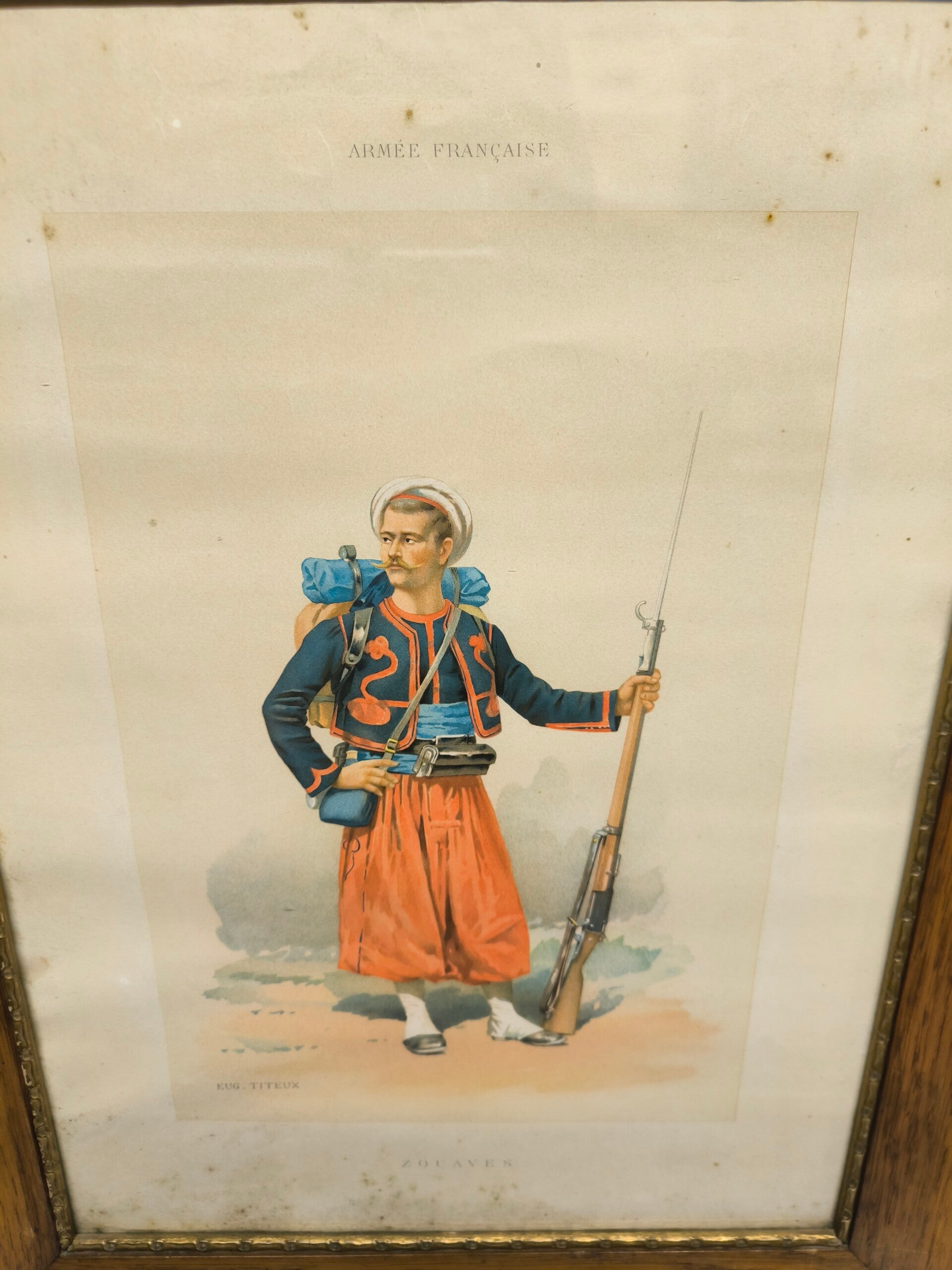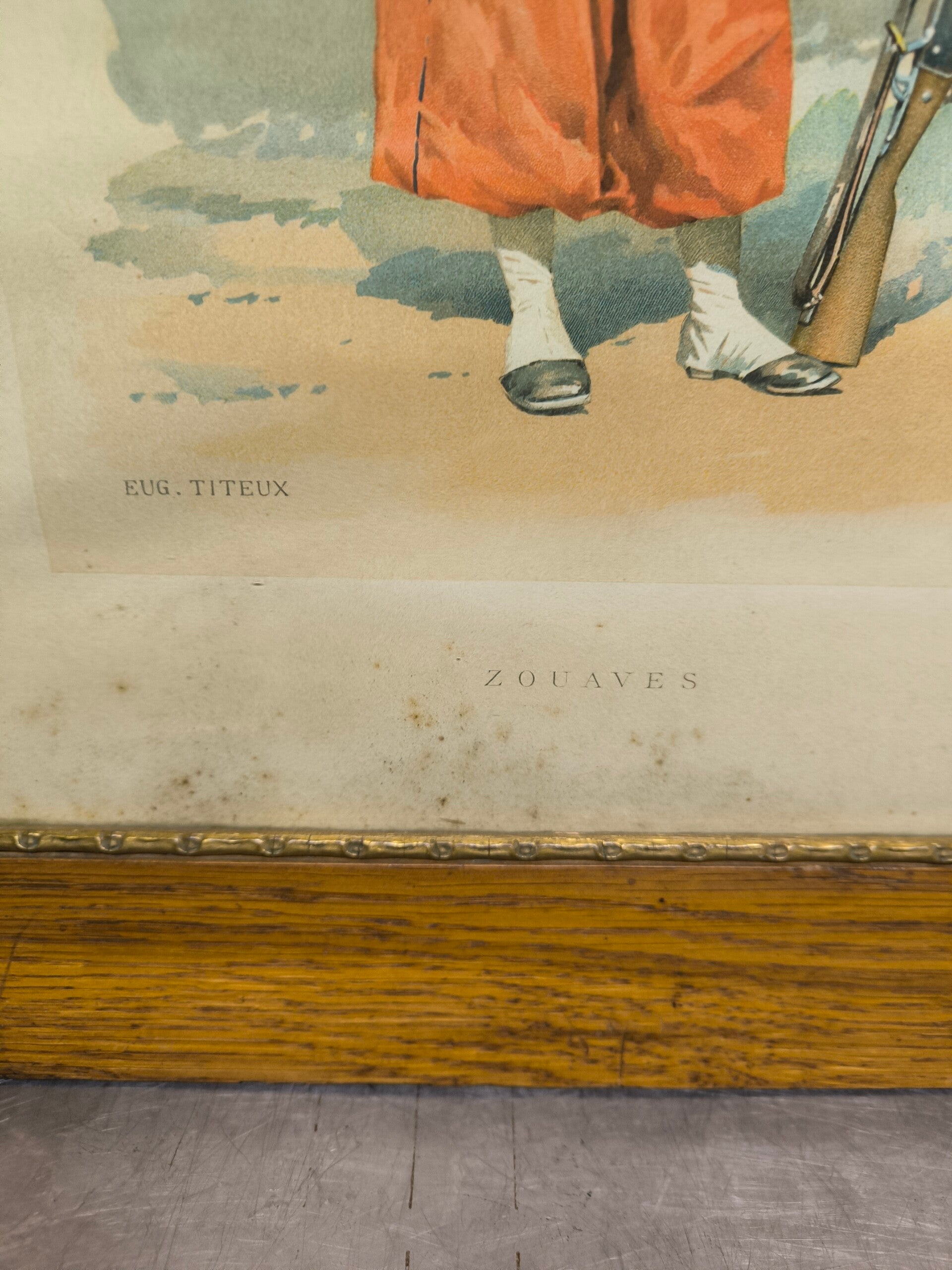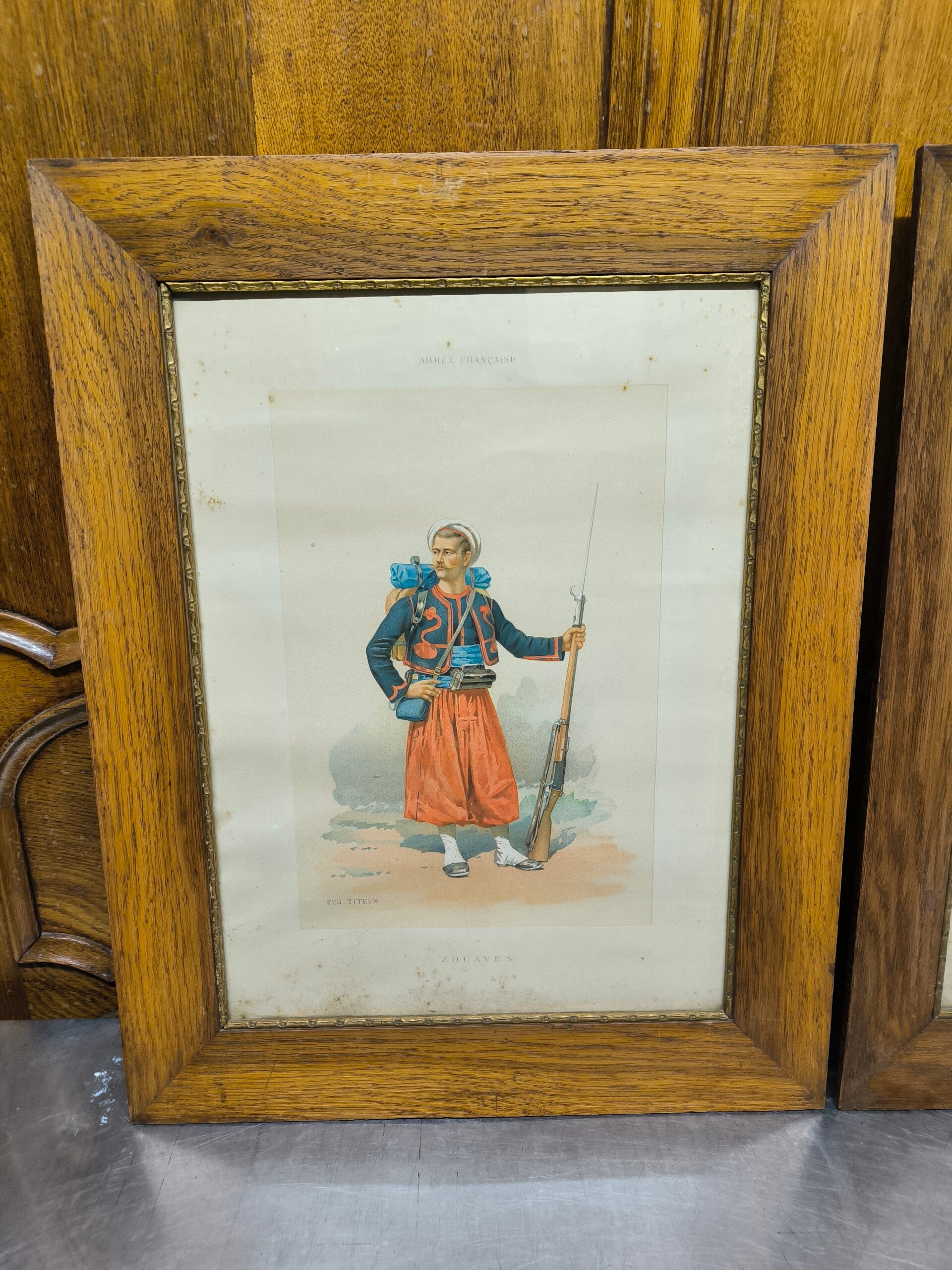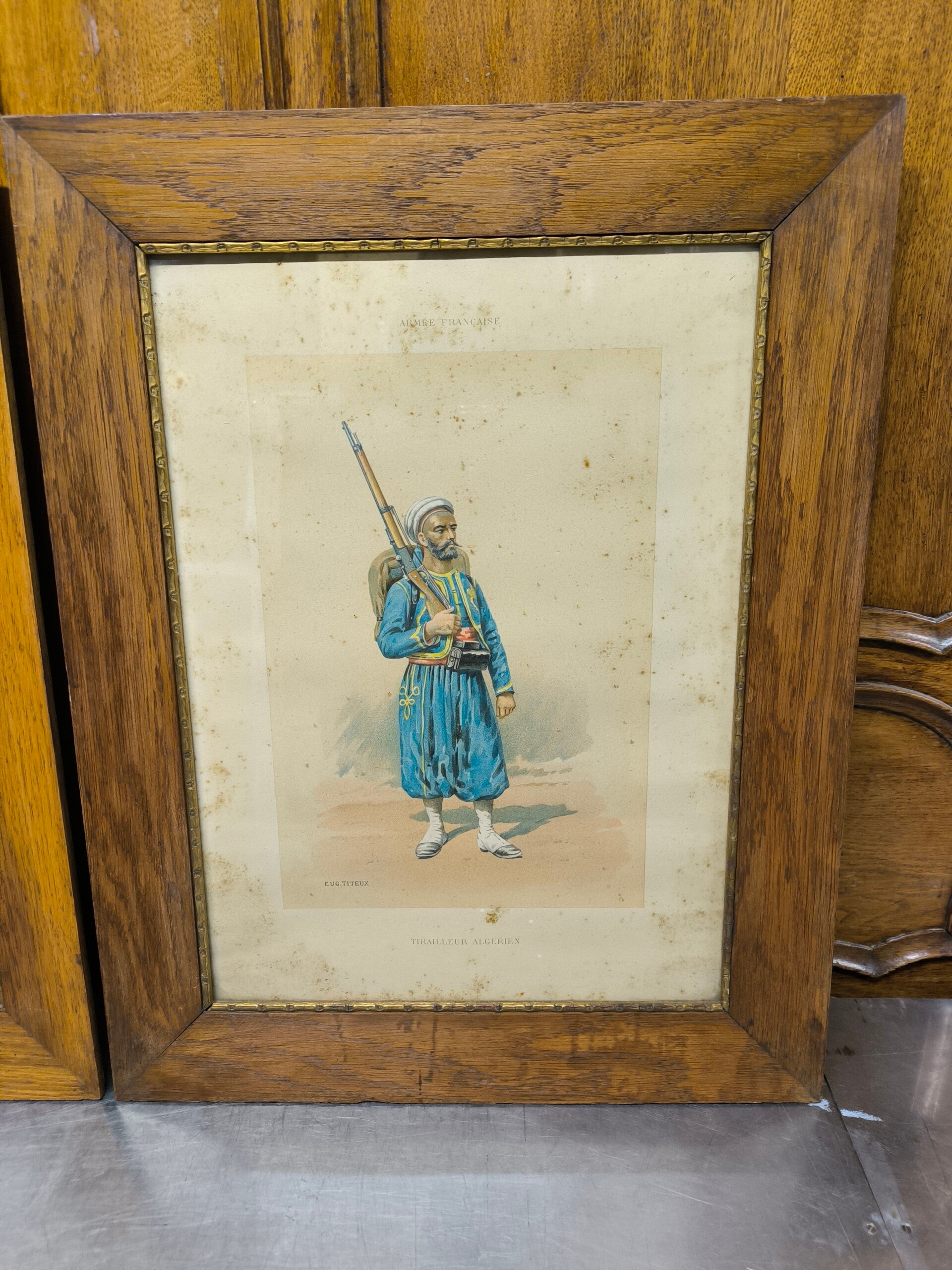 Paire de Gravures Armée Tirailleurs Algériens Zouaves, armée française, guerre d'Algérie.Traces d'usures, rousseurs, cadre bois massif.Largeur 45cm Hauteur 57cmEpaisseur 3cmPoids 5kg
