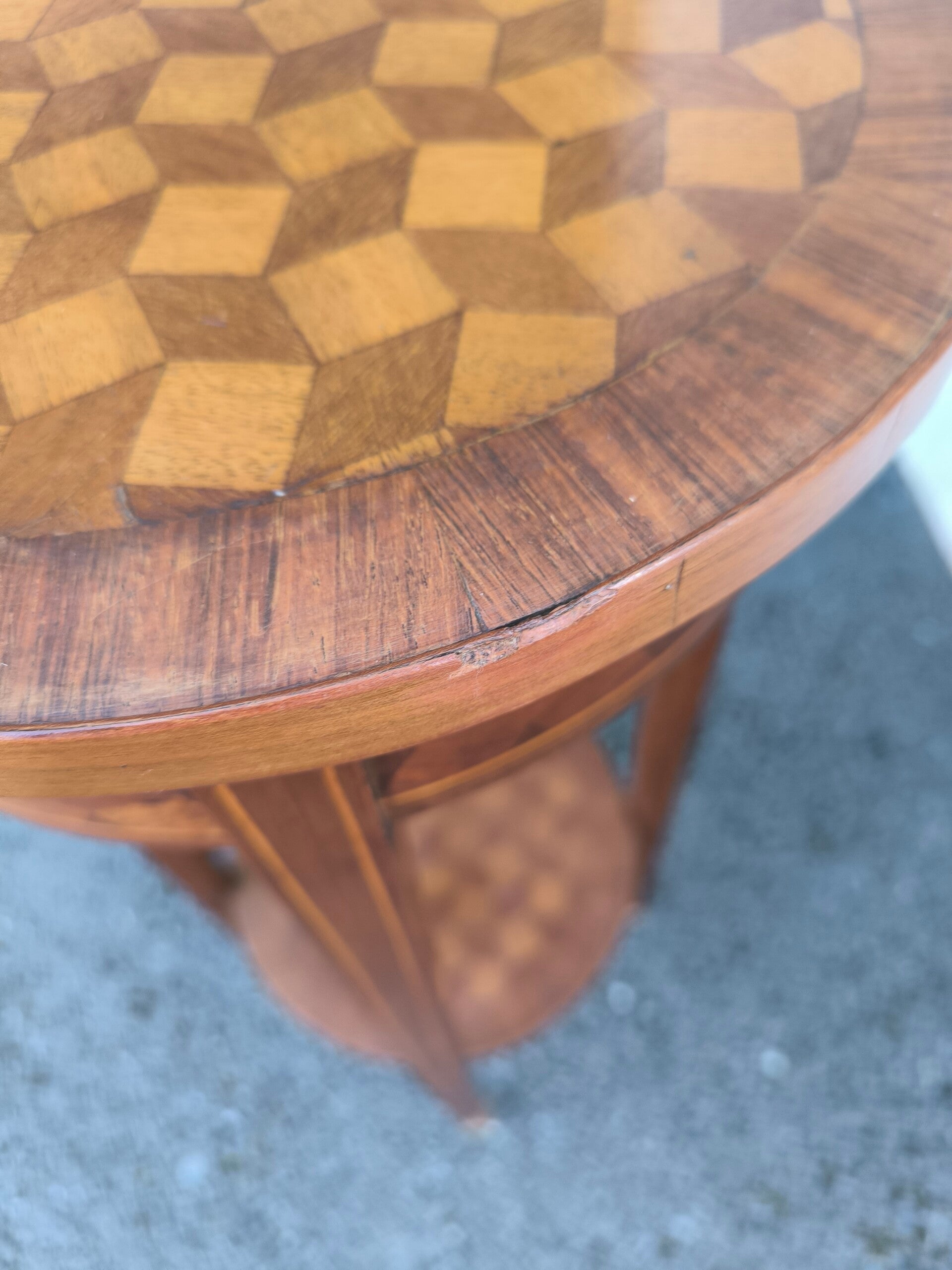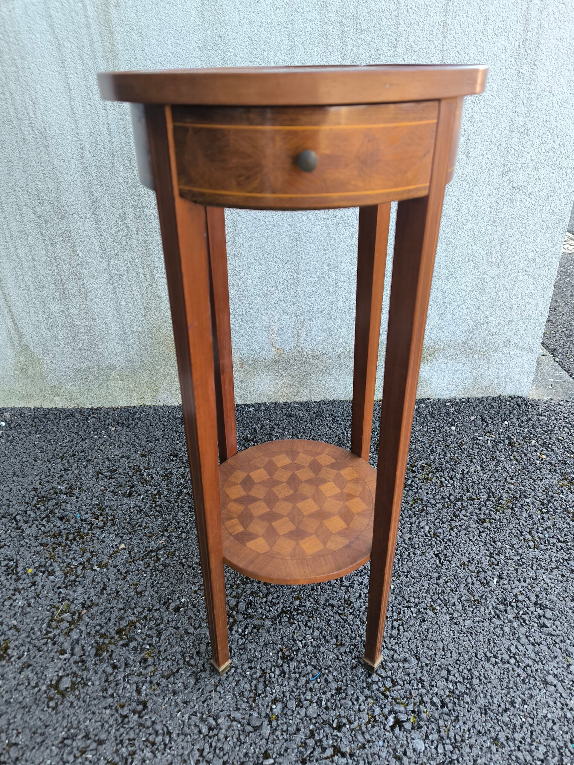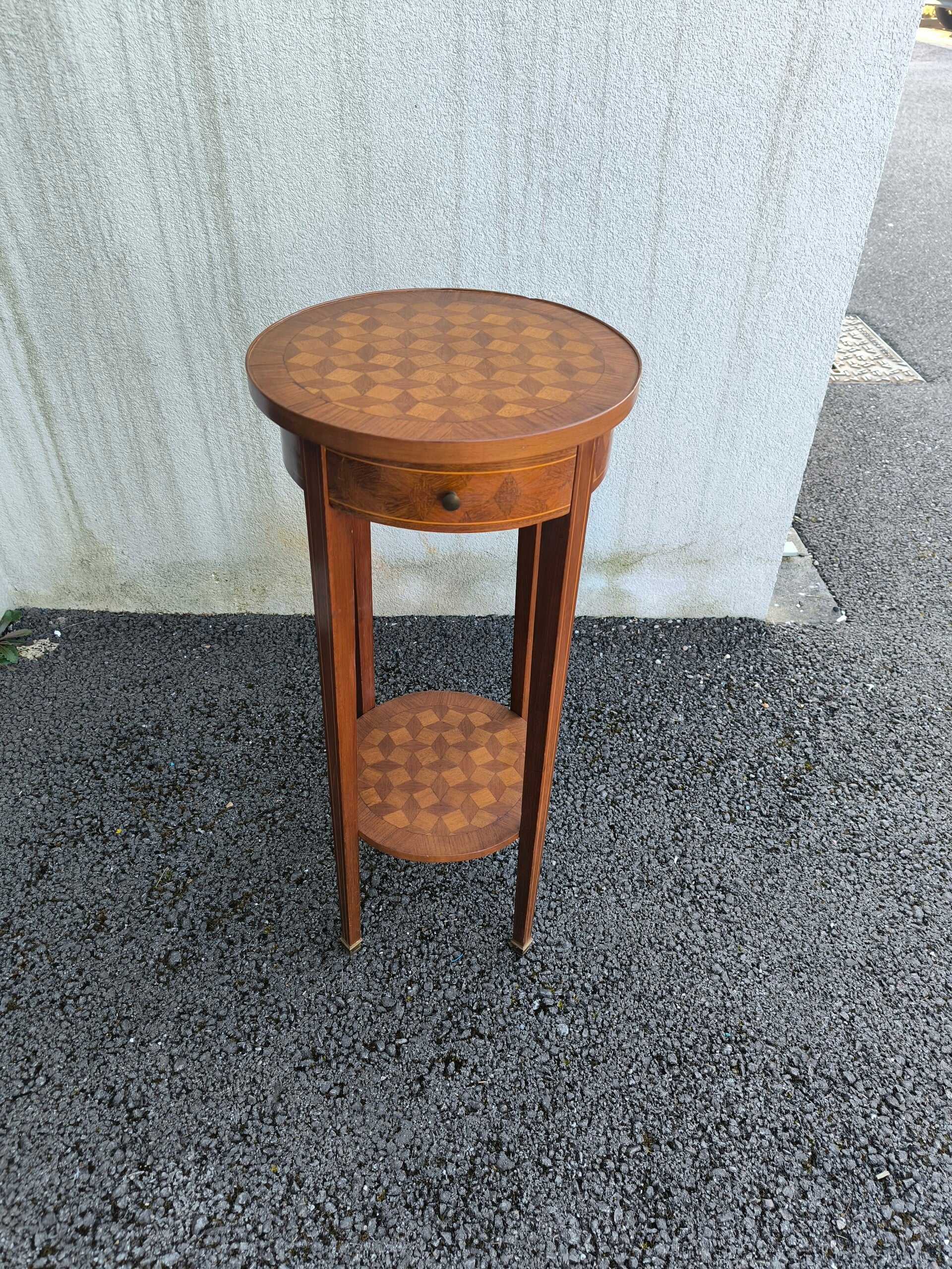 Sellette de style Louis XVI à marqueterie.Traces d'usures, restaurations.Pieds embouts laiton, 1 tiroir.Hauteur 75cm Largeur 33cm Profondeur 33cmPoids 3kg
