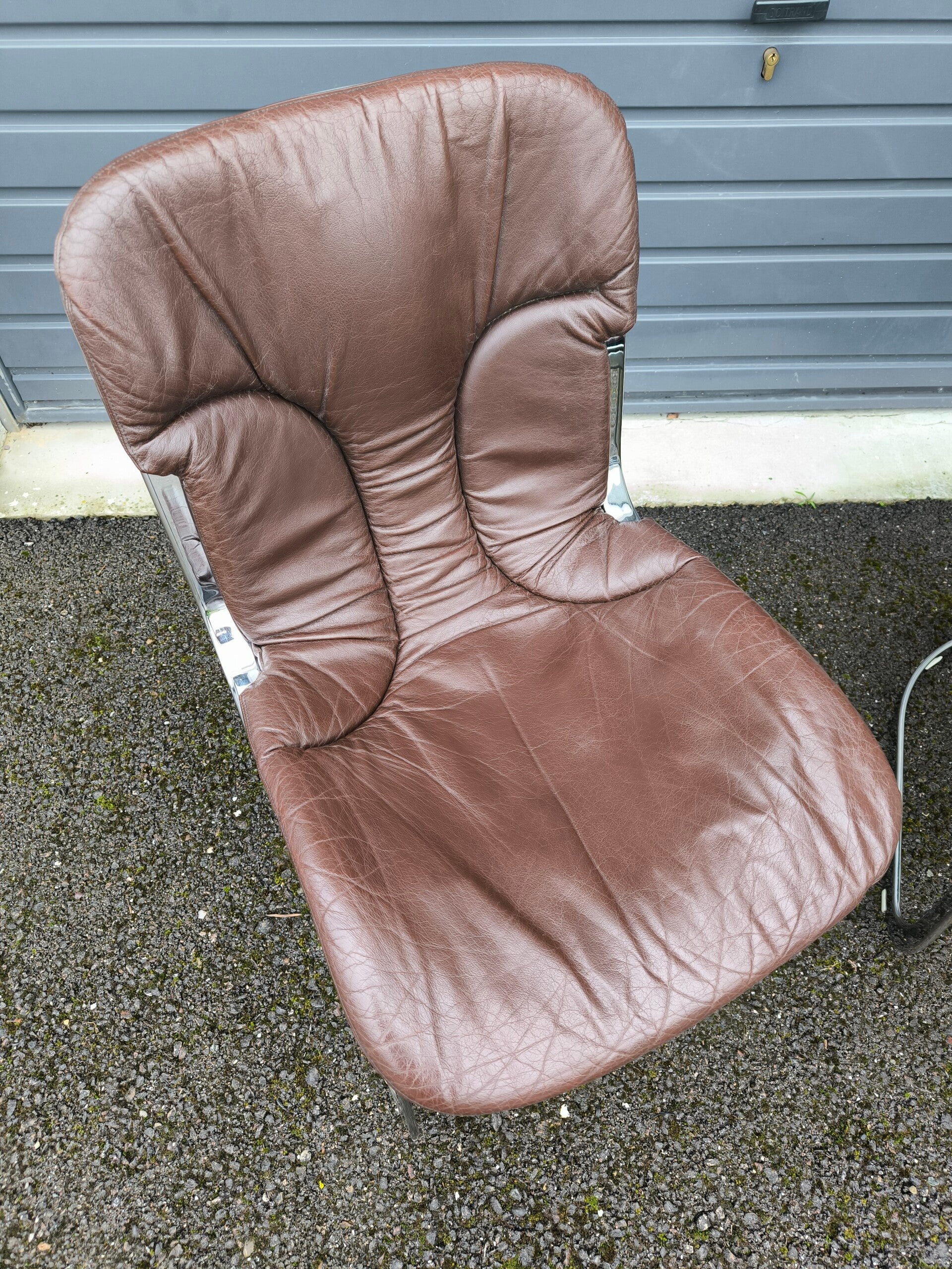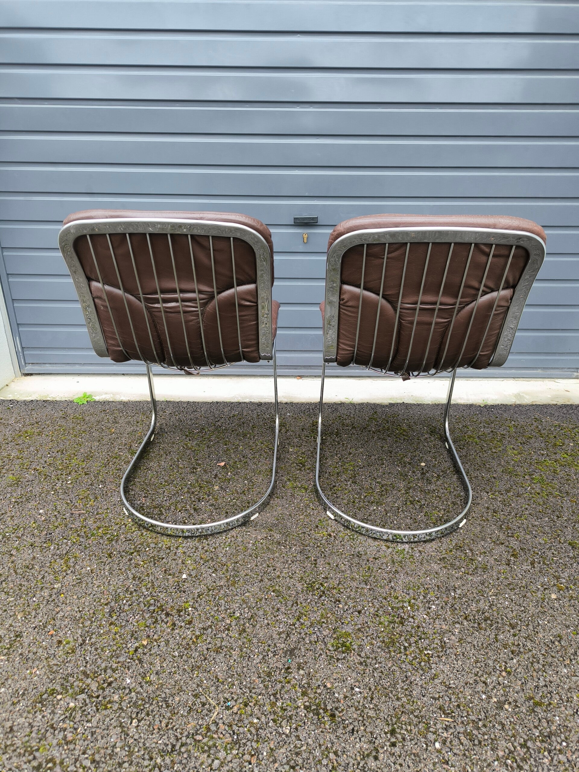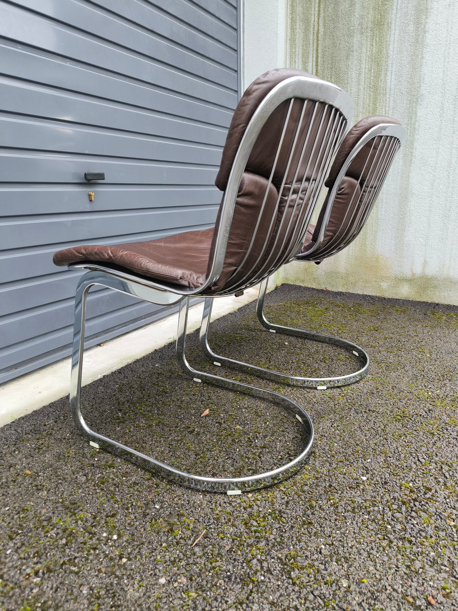 Paire de chaises éditées par Cidue en métal chromé et cuir brun.