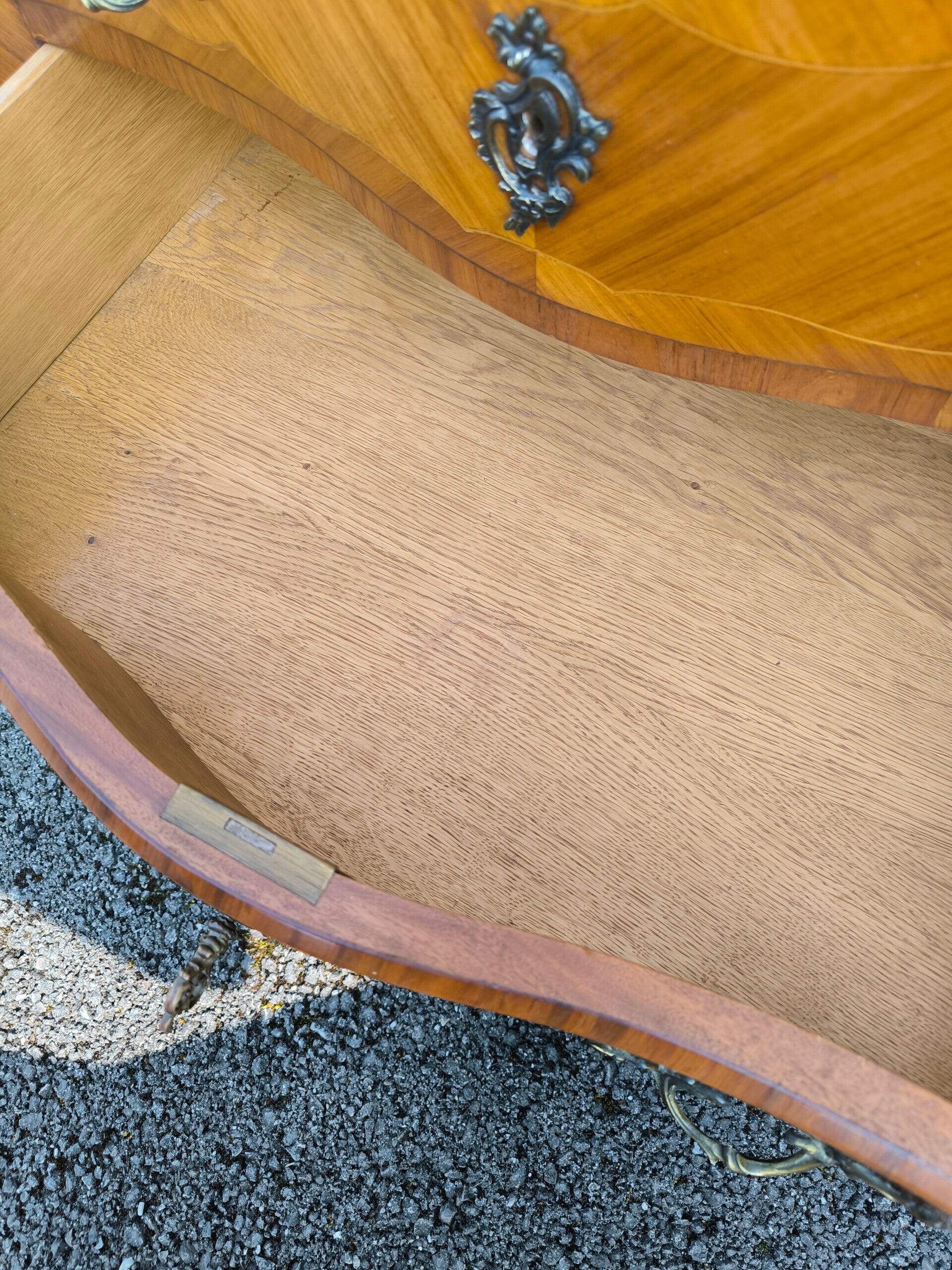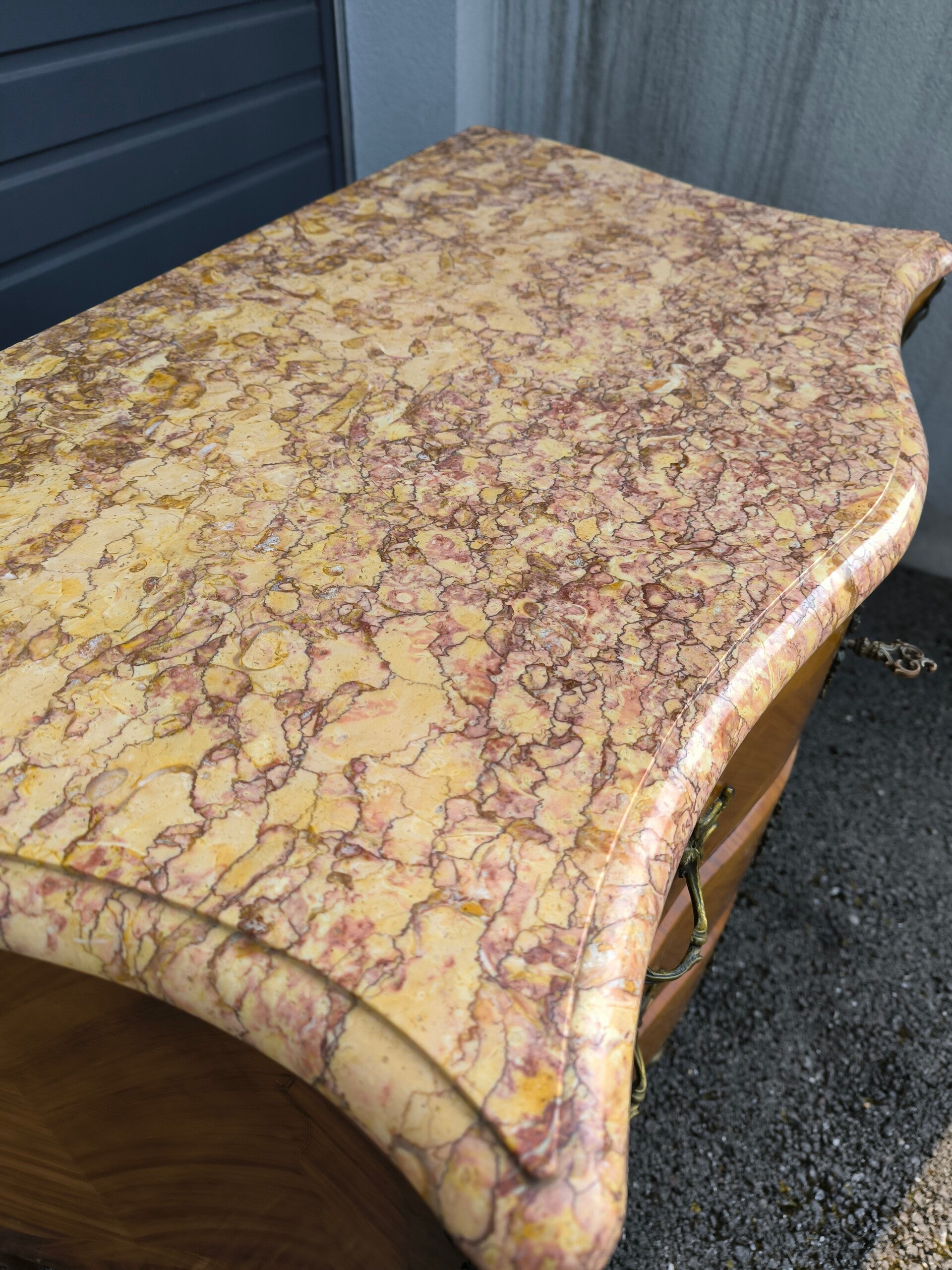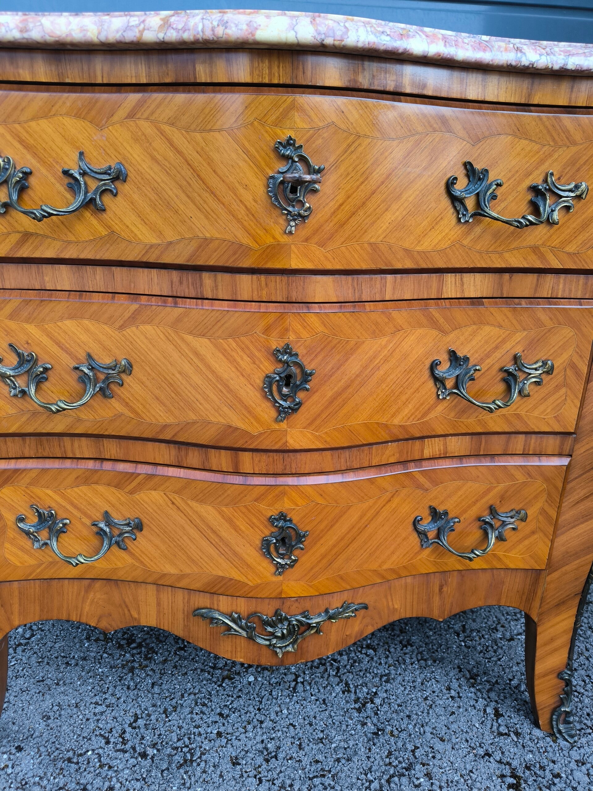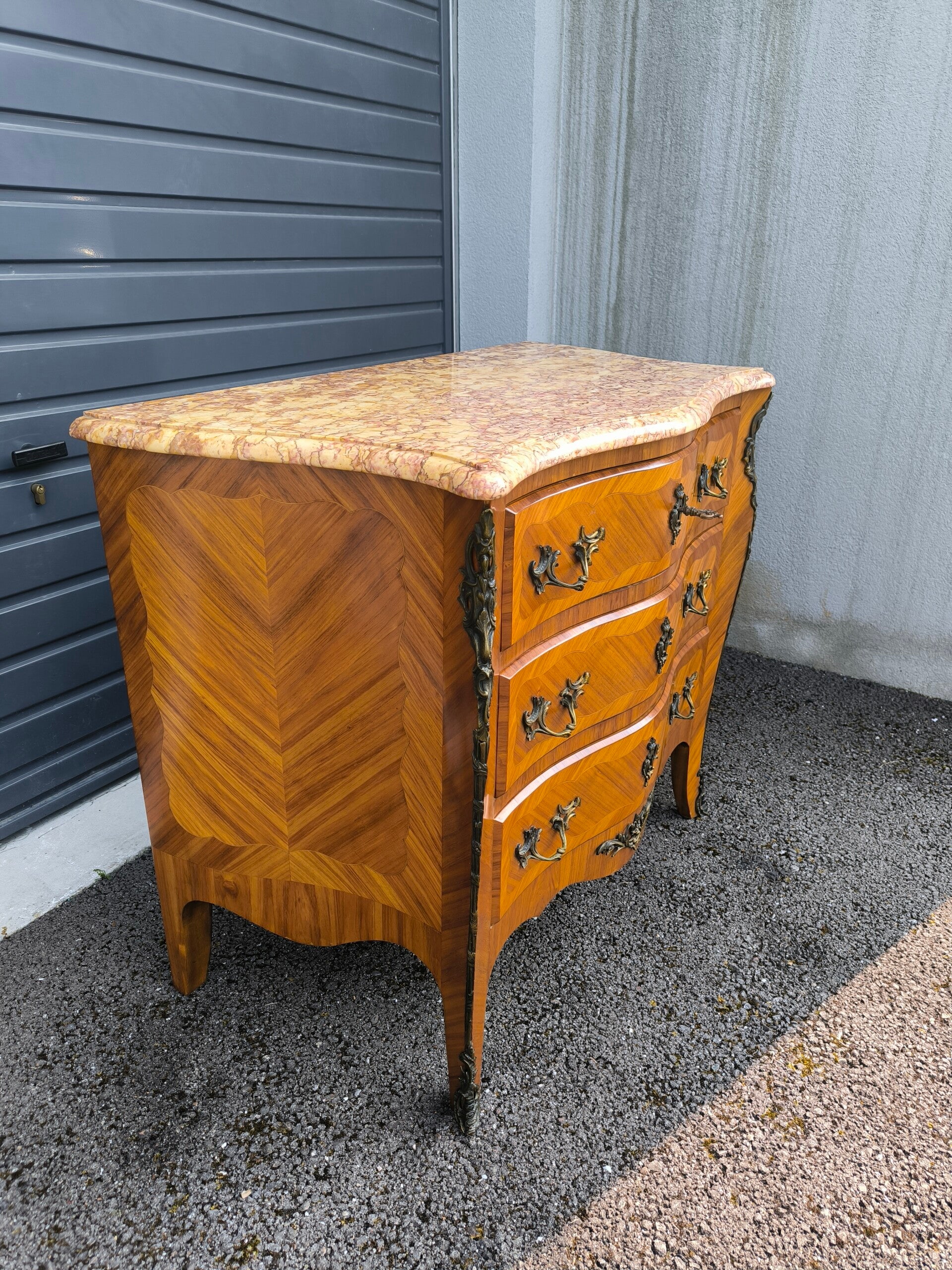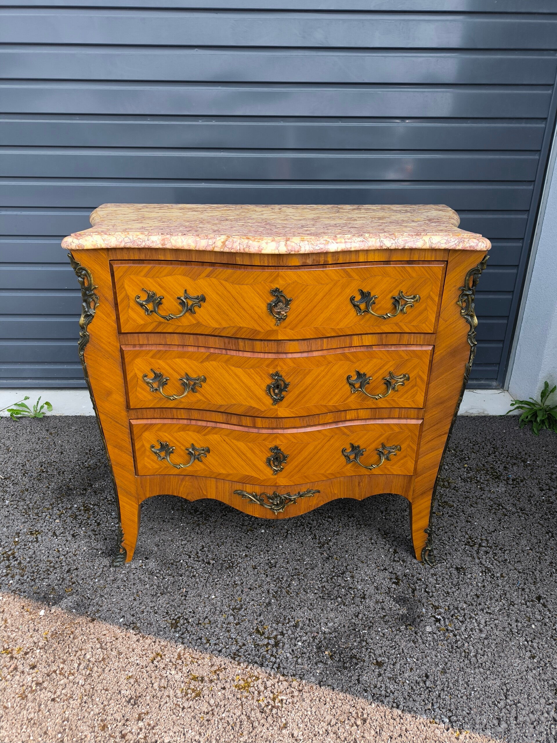 Commode style Louis XV en marqueterie.Marbre mouluré posé sur le dessus3 tiroirs avec serrures fonctionnellesOrnements bronzeTrès bel état général, quelques traçes d'usuresEstampille au dos de fabrication