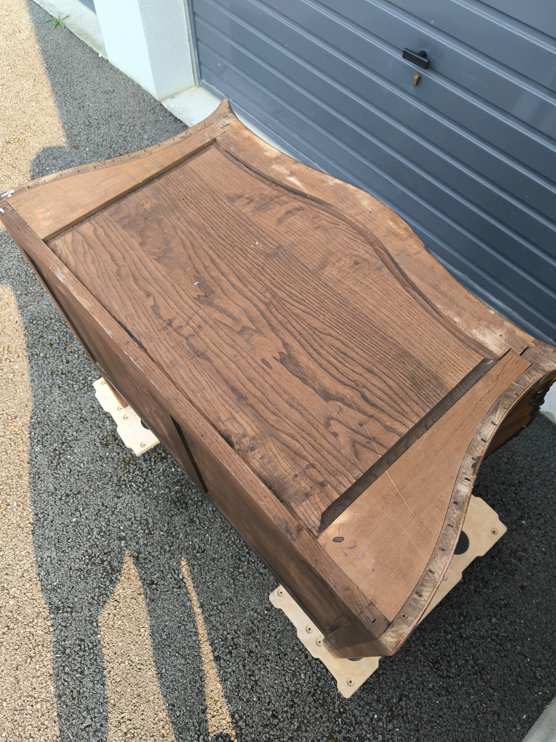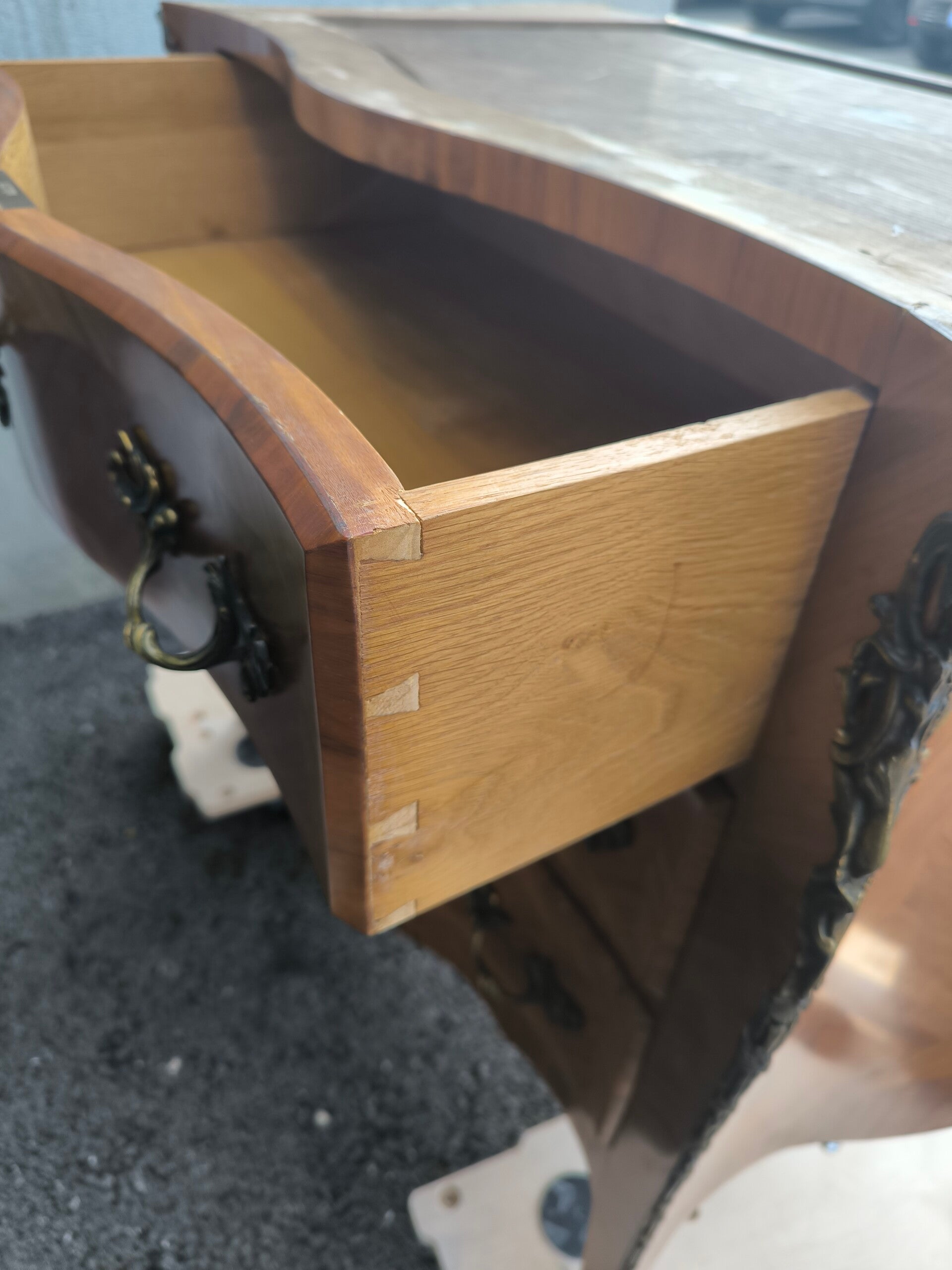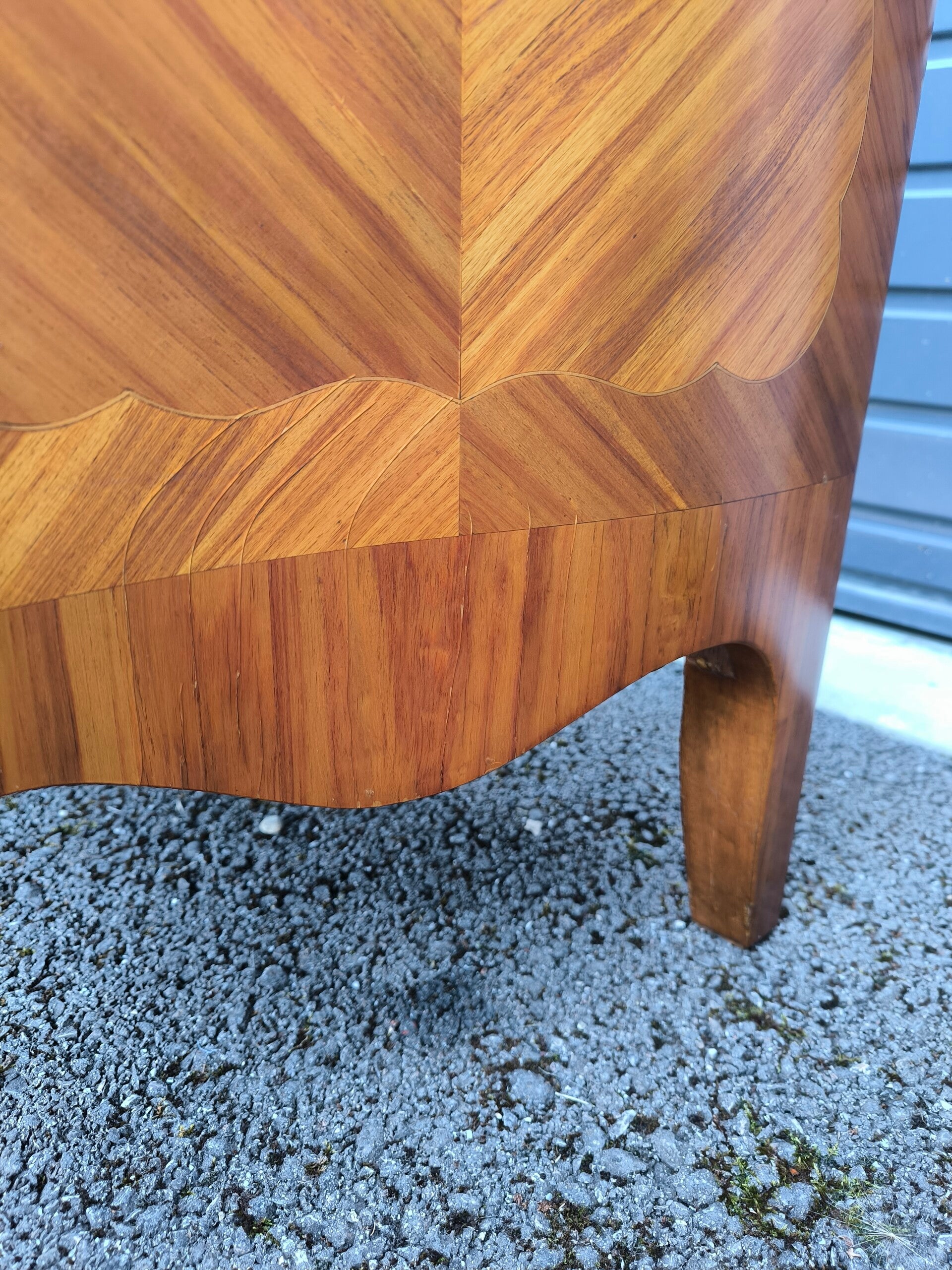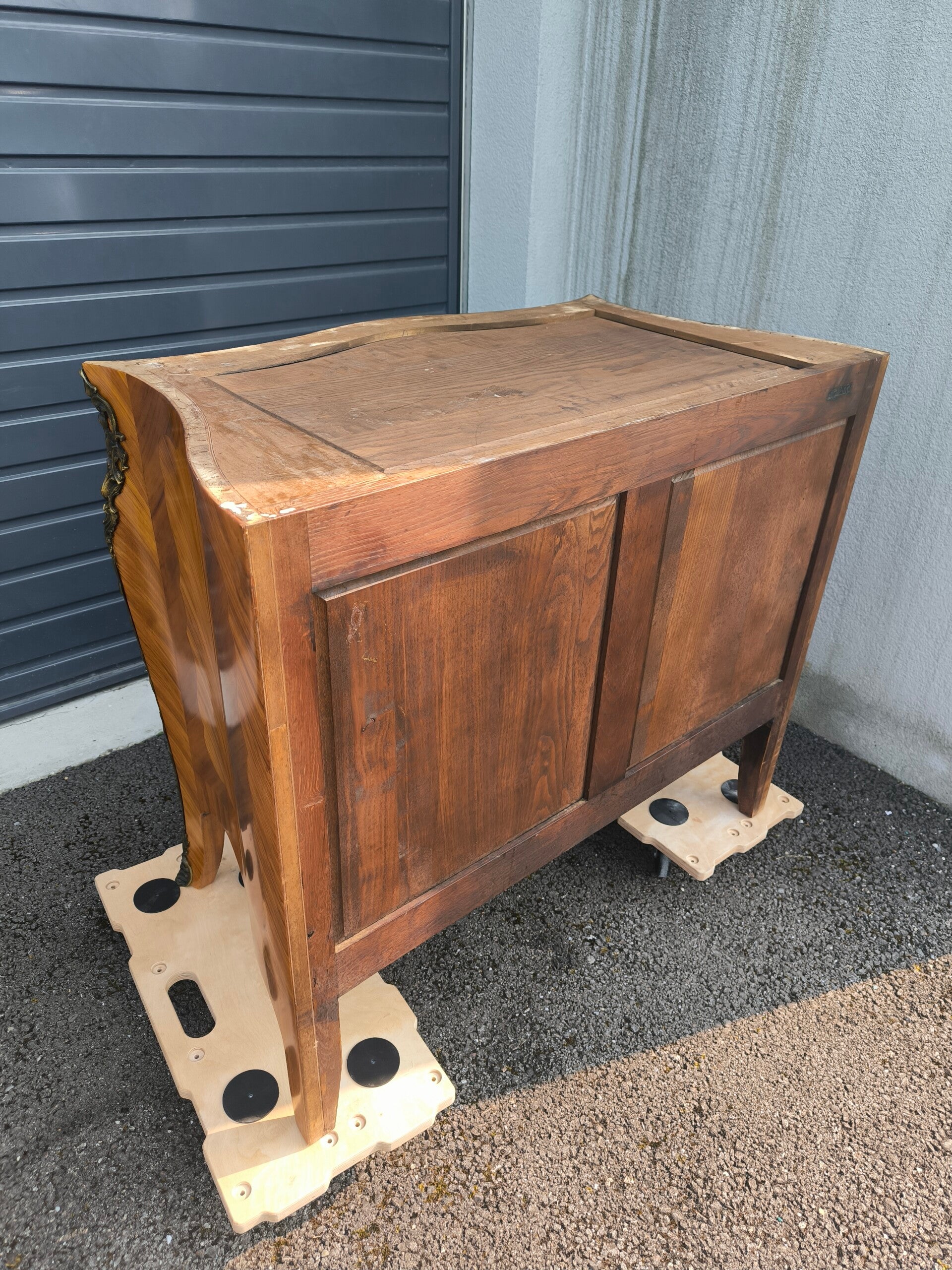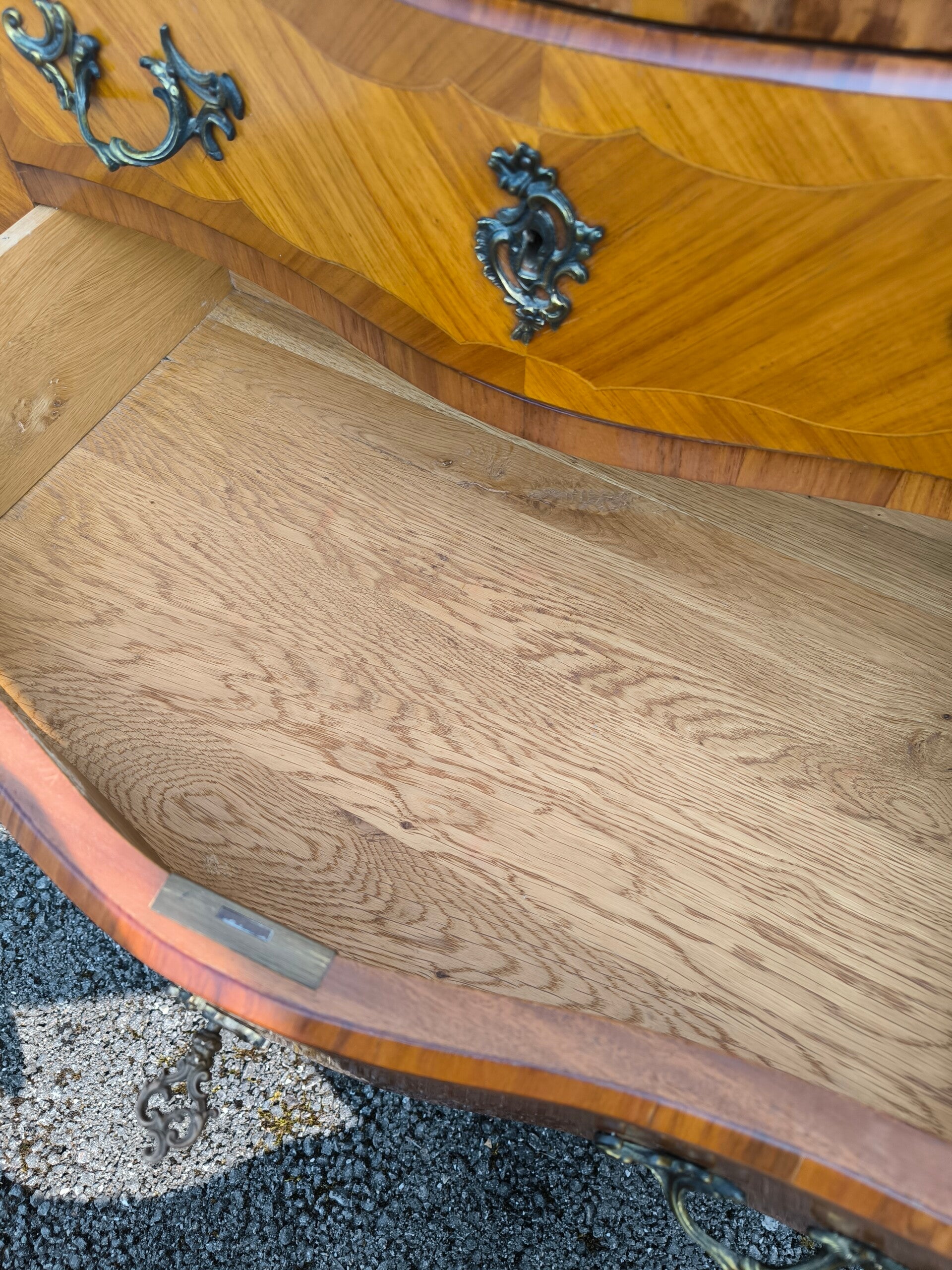 Commode style Louis XV en marqueterie.Marbre mouluré posé sur le dessus3 tiroirs avec serrures fonctionnellesOrnements bronzeTrès bel état général, quelques traçes d'usuresEstampille au dos de fabrication